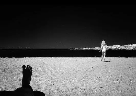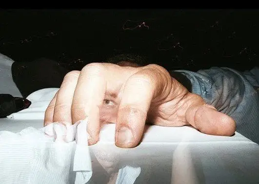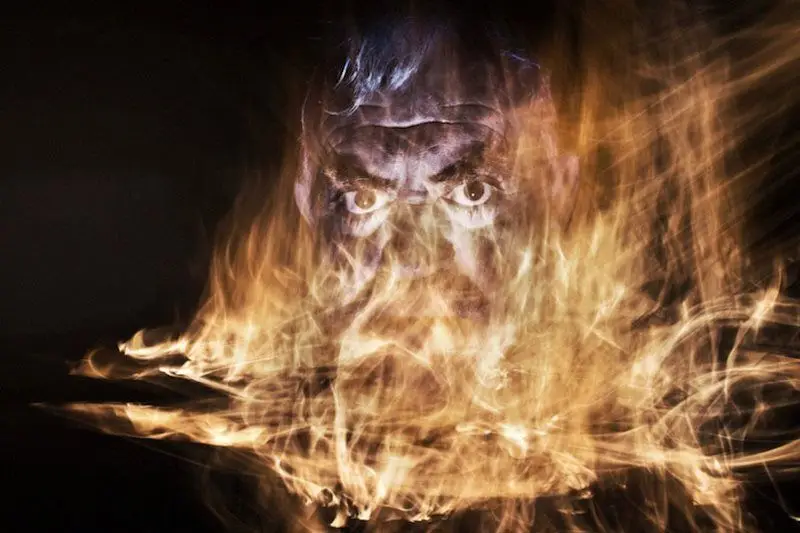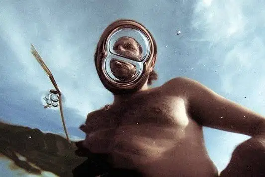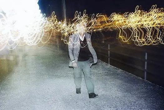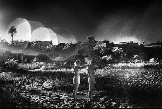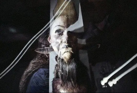 costruzione fotografica con luci, una donna e una capra fuse insieme