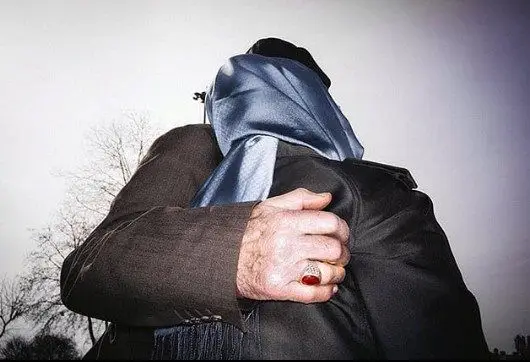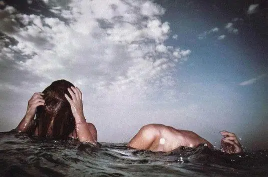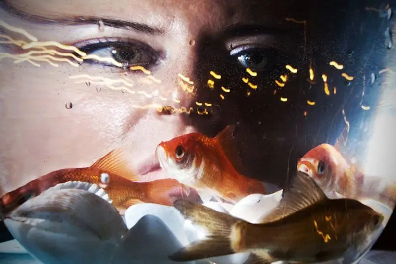 pesci rossi in boccia di vetro con donna sullo sfondo