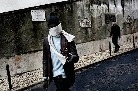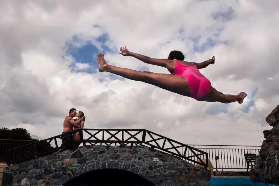 bimba effettua tuffo acrobatico con coppia che si bacia sul ponte