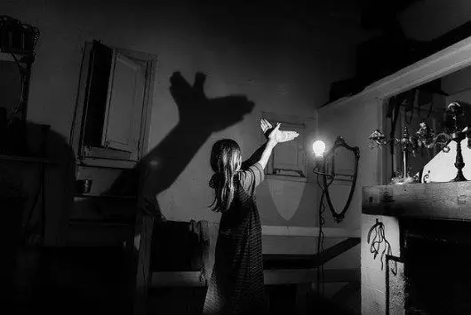 ragazza simula con le mani un uccello riflesso come ombra sul muro