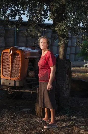 anziana signora di campagna con trattore e ulivo sullo sfondo