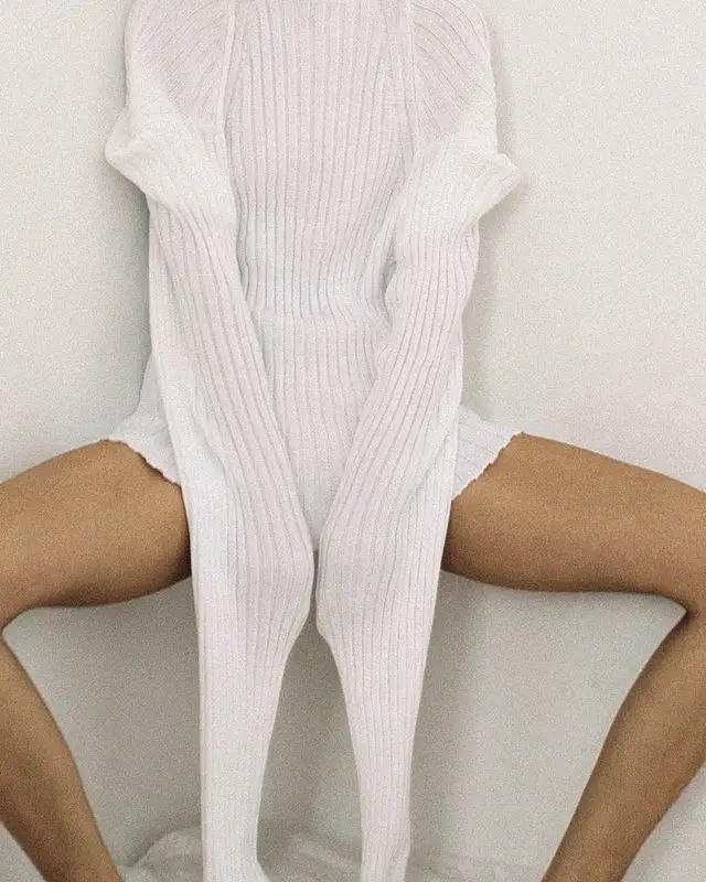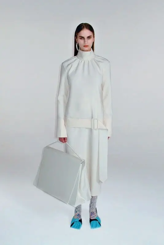 Donna con borsa e abito lungo bianchi e scarpe blu
