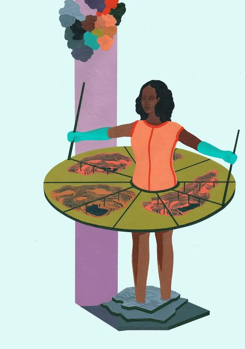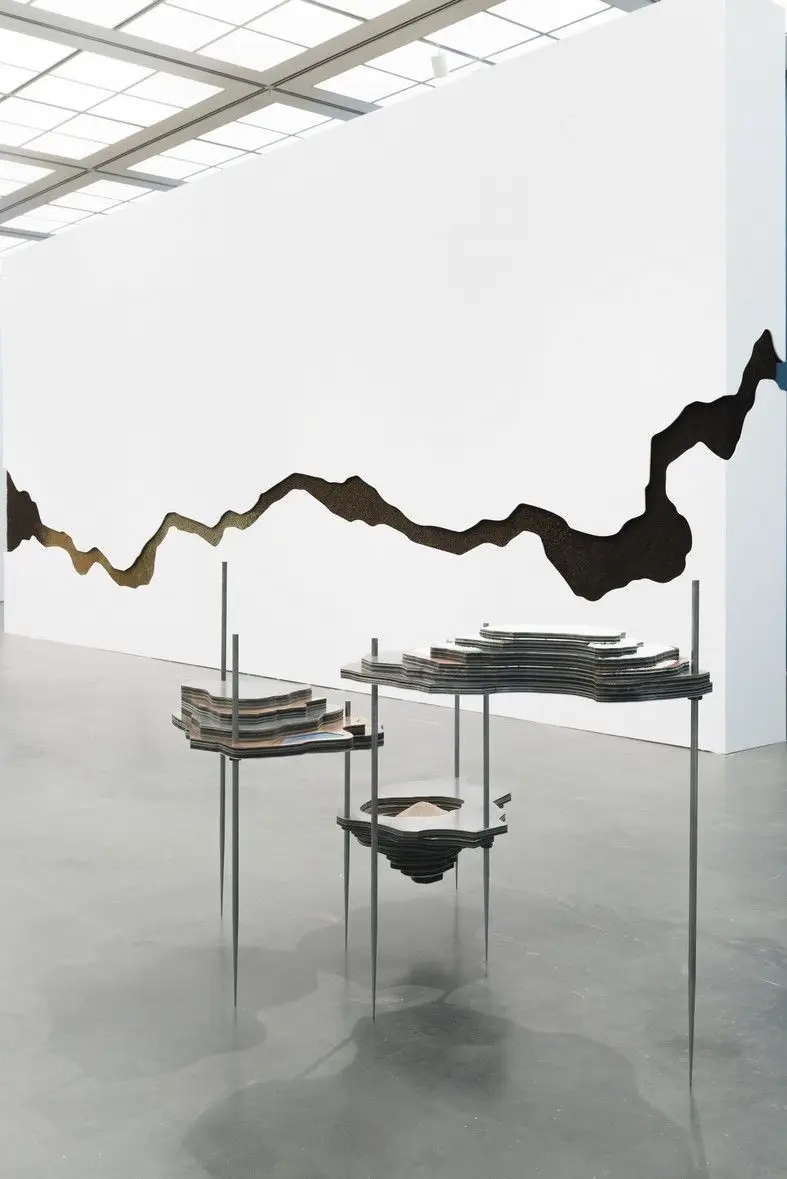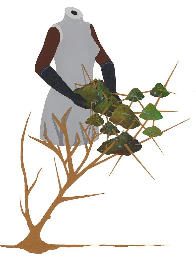 “My work is interconnected with the places I’ve lived. What happens in one affects another. This is true for nature too.” Otobong Nkanga (born 1974) is a Nigerian-born visual artist and performance artist, based in Antwerp, Belgium. In 2015 she won the Yanghyun Prize. In her work she explores the social and topographical changes of her environment, observes their inherent complexities and understands how resources such as soil and earth, and their potential values, are subject to regional and cultural analysis. Her work has been featured in many institutions including the Tate Modern the KW Institute (Berlin), the Stedelijk Museum and the biennale of Sharjah. She also took part in the 20th Biennale of Sydney. Nkanga is a contemporary artist that likes to incorporate natural resources into her art to portray themes of neocolonialism and ecological violence. Nkanga uses many forms of media such as drawings, photographs, painting, videos, and sculptures, however she is mostly known for her installations. Some characteristics found in her art include “material emotionality” which is the idea that objects can feel, think, and remember. She uses this idea to communicate the experiences of natural materials in her installations. Body fragmentation is another characteristic that shows up in her works and it implies a lack of sense of a true whole. With the use of natural science objects as mediums Nkanga is able to tie together different ideas of culture, socioeconomics, and politics. All of Nkanga’s art has a purpose behind them and the most common purpose is environmental protection.