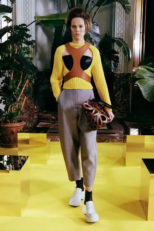 Woman with yellow sweater, leather accessory and gray pants