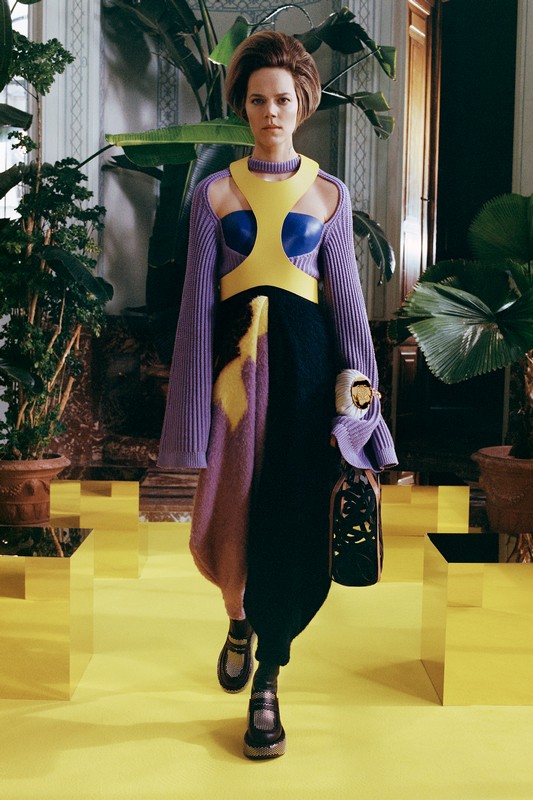 Woman with purple sweater, leather accessory and printed skirt
