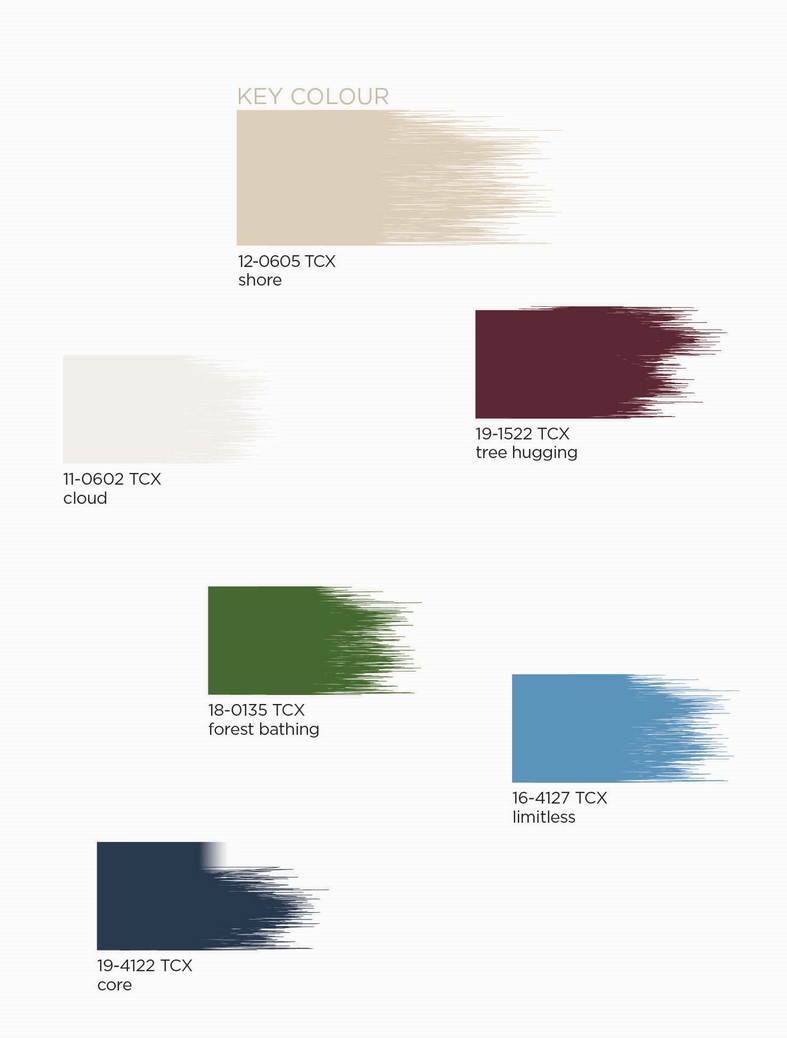 The palette of Breathe is inspired by places of meditation, ranging from forest green to clay and bark, opening up to sky blue, racing clouds white and grey.