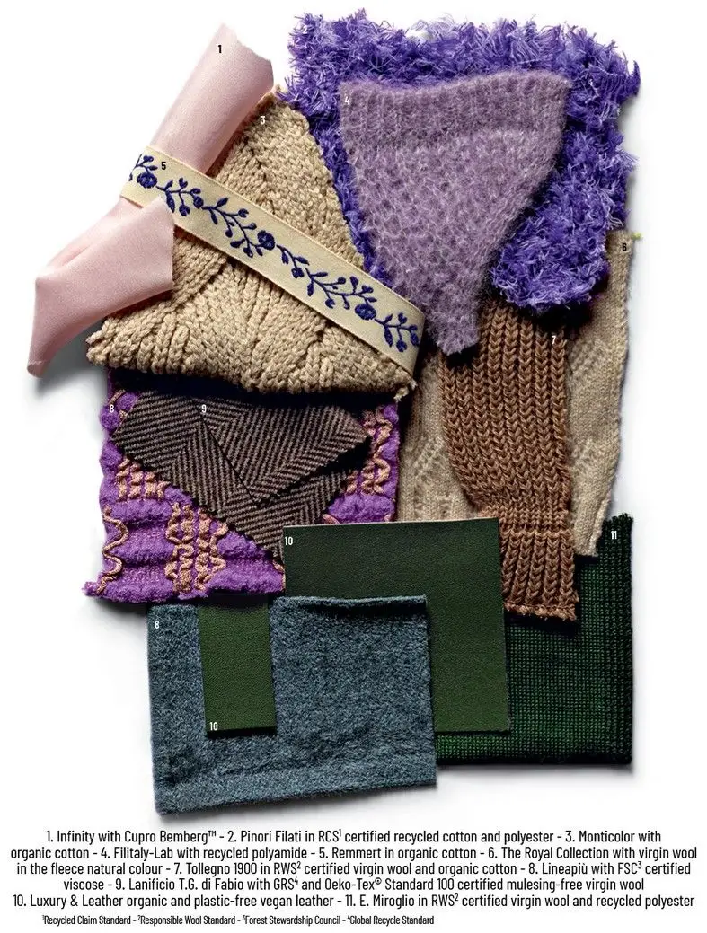 A stroll through gardens in the Yorkshire countryside, cradled by the scent of wisteria and freshly-cut grass and immersed in a romantic, dreamy palette. A bouquet of soft recycled yarns, virgin wool blended with organic cotton, vegan leather, sleek Cupro Bemberg™ fabrics and accessories with a retro, English feel