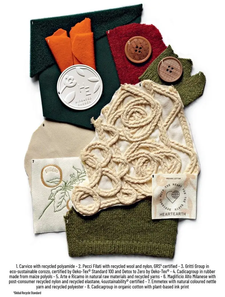 The Liberty style architecture of old Italian greenhouses coupled with the intense colour combinations of the flowers and plants they house tell a story filled with thick fabrics in recycled polyamide, GRS-certified yarns, 4sustainability-certified fabrics, labels in nettle or organic cotton, and buttons in eco-sustainable corozo.
