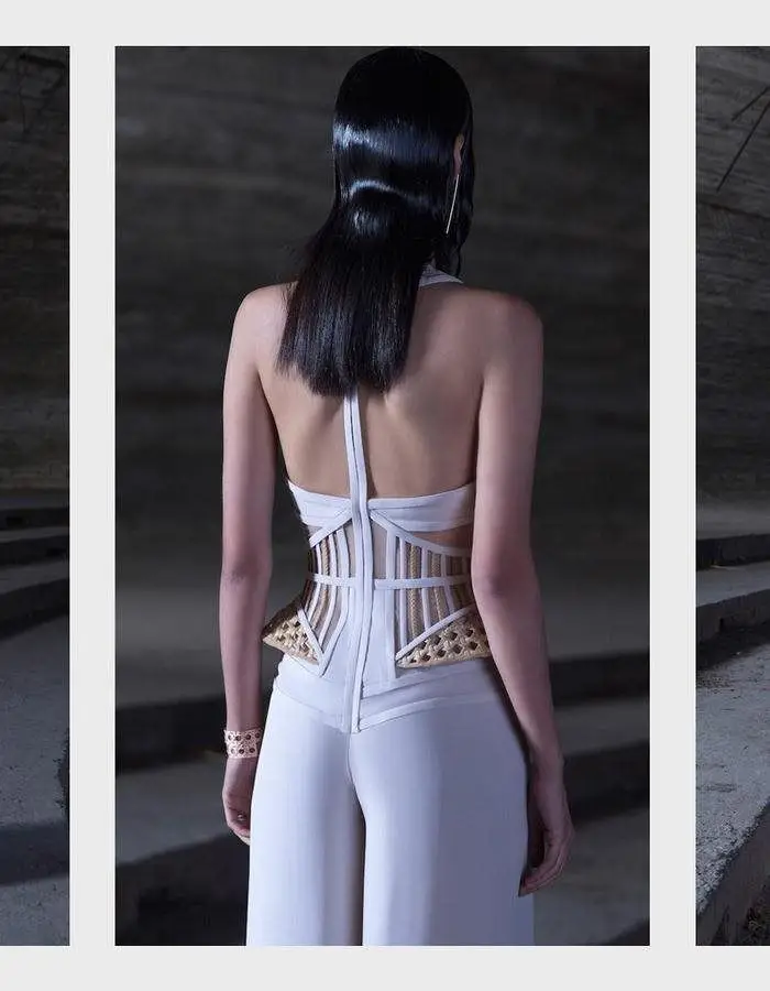 Model with top and trousers