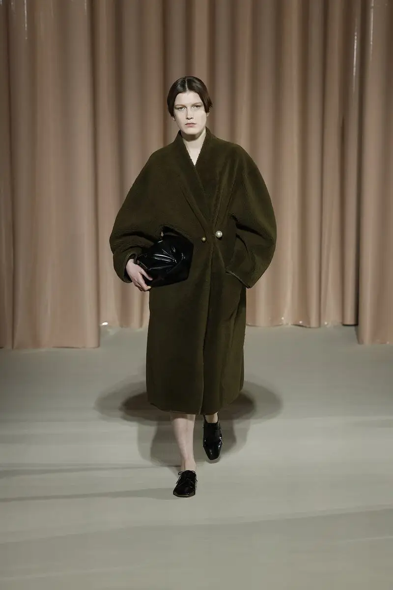 The intrepid Colette, unconventional and sensual, lives on in Max Mara’s collection, beginning with the 1910s-inspired, oval silhouetted long coats and the geometrically shaped, crystal-festooned dresses. Masculine and feminine were once again mixed, featuring rigorous lines and Japanese-inspired details, such as an obi-style knit band replacing a belt and the kimono-style outerwear.