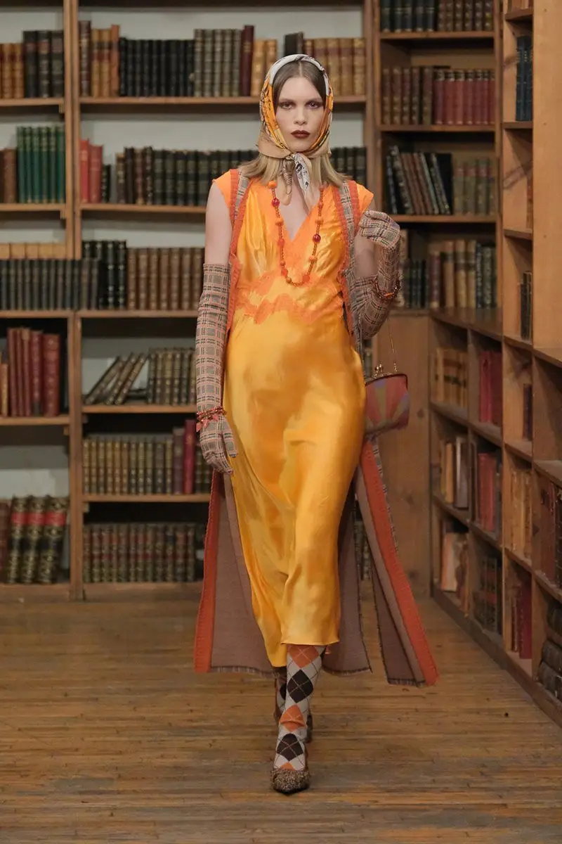 Take Anna Sui, who is always colourful and ‘folkloristic’; this time her love of vintage was imbued with a touch of grunge and Miss Marple, Agatha Christie’s heroine. A fusion of styles and garments was given an injection of verve, with kilts worn over loose cargo pants, vintage hand-dyed lingerie teamed with knitwear, headgear, lozenge socks, neck scarves and long gloves.