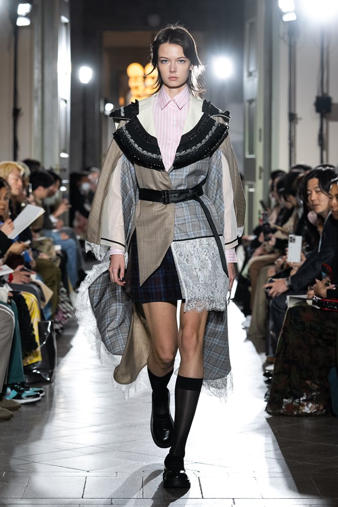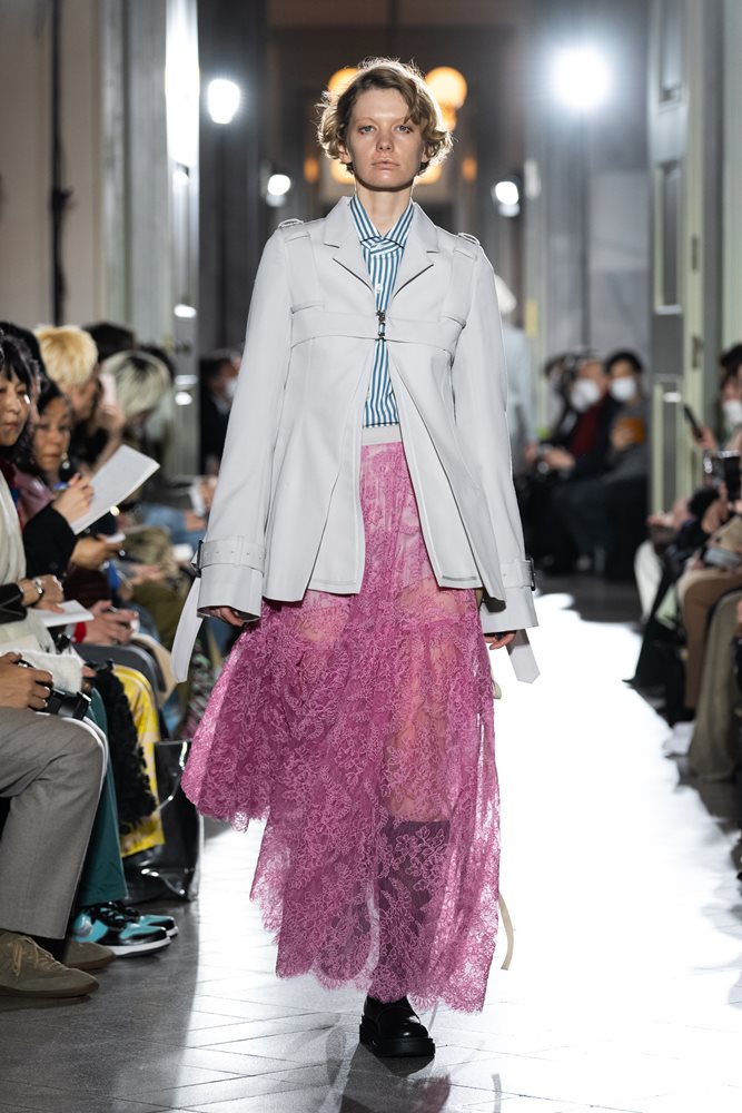 Theme of this collection is Japan = Italy Project. The cape coat, which is a representative item of this season’s art piece using designer Koike’s unique technique, is made of high-end fabric and lace imported from Italy.