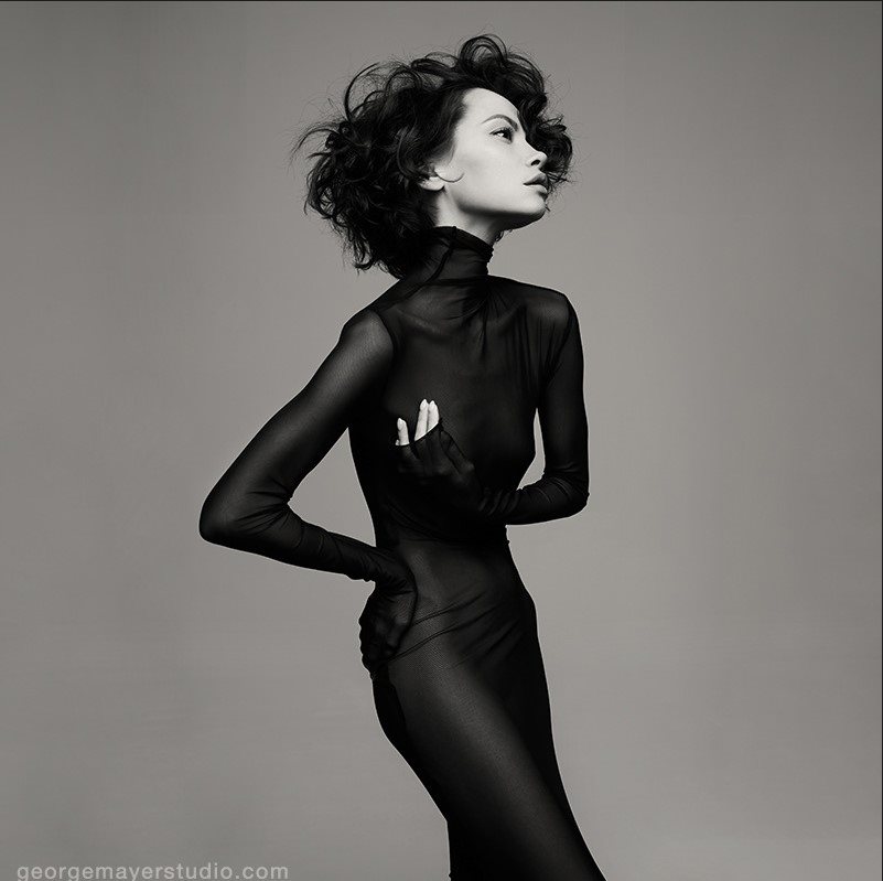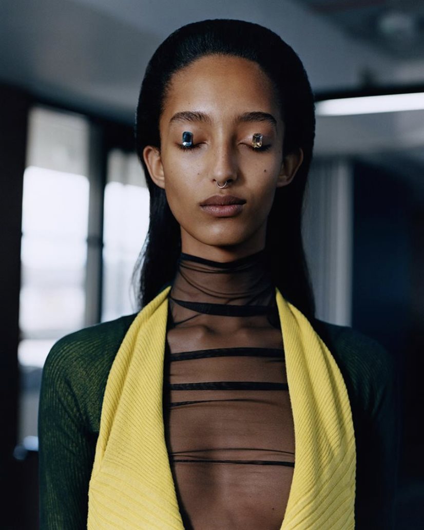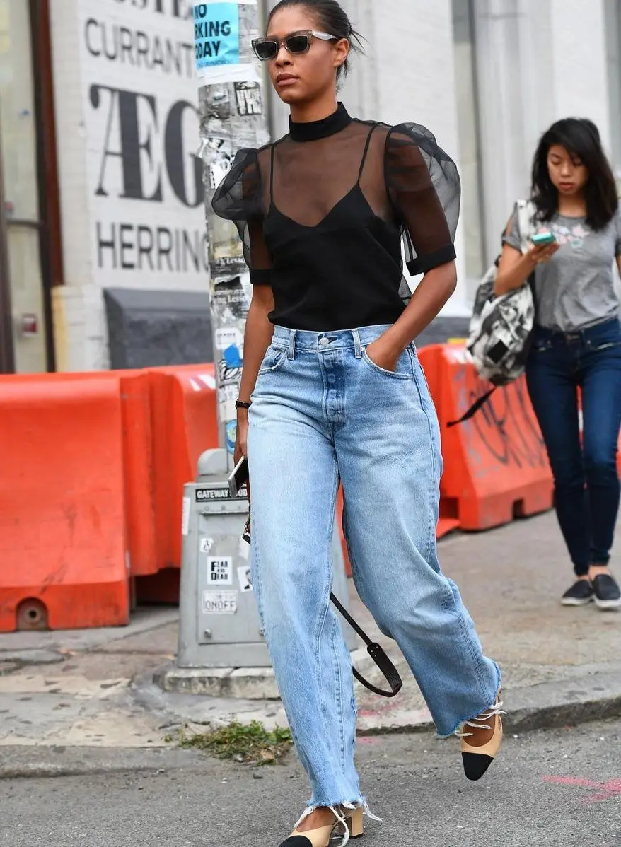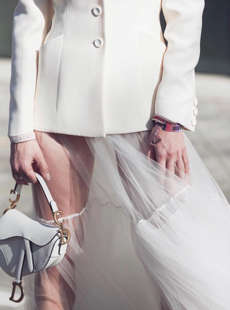 girl with transparent black skirt with rhinestones and black Dior saddle