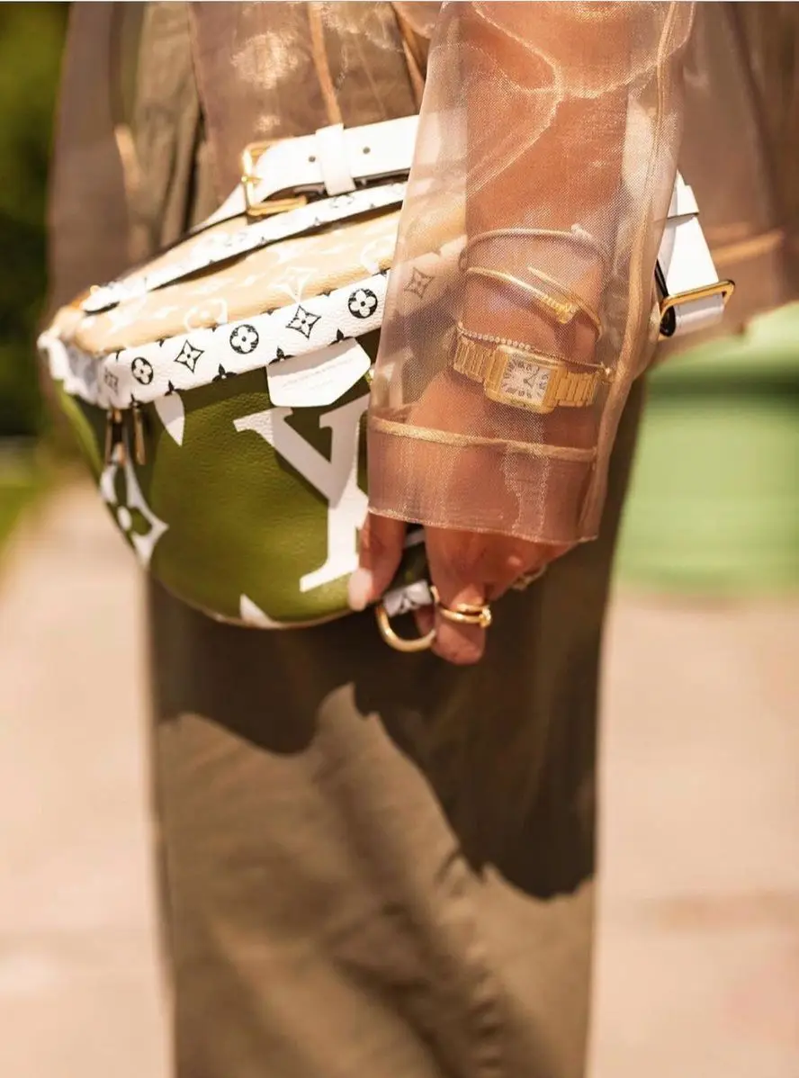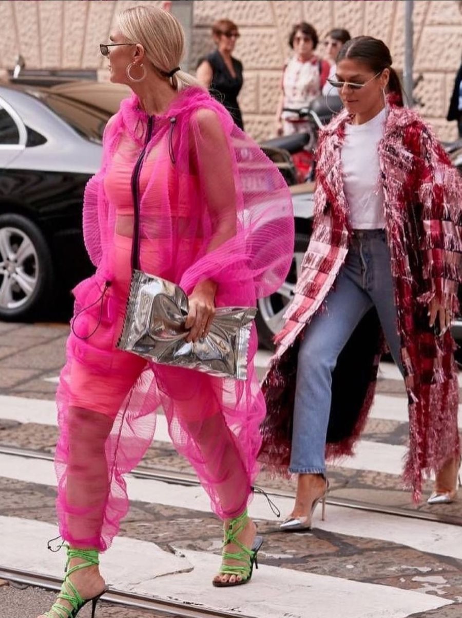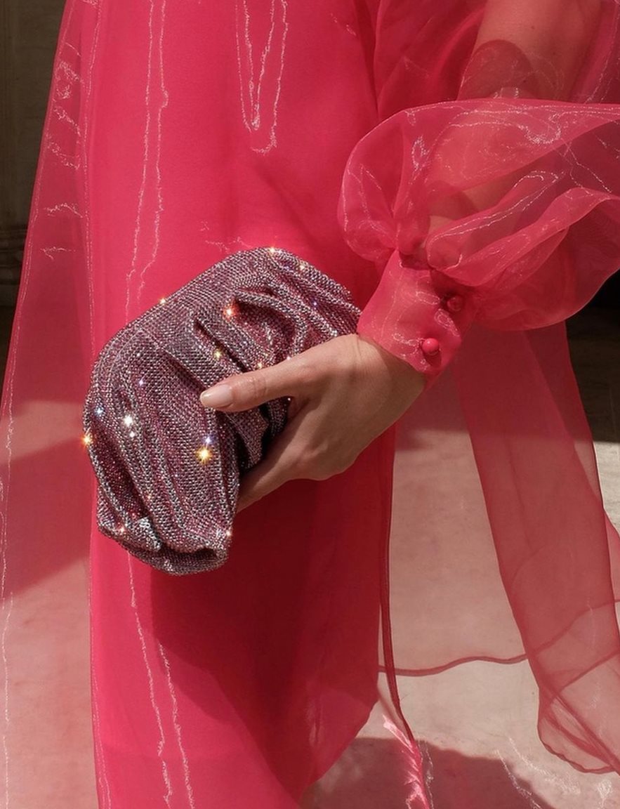 girl with transparent pink blouse and Jacquemus fuchsia bag