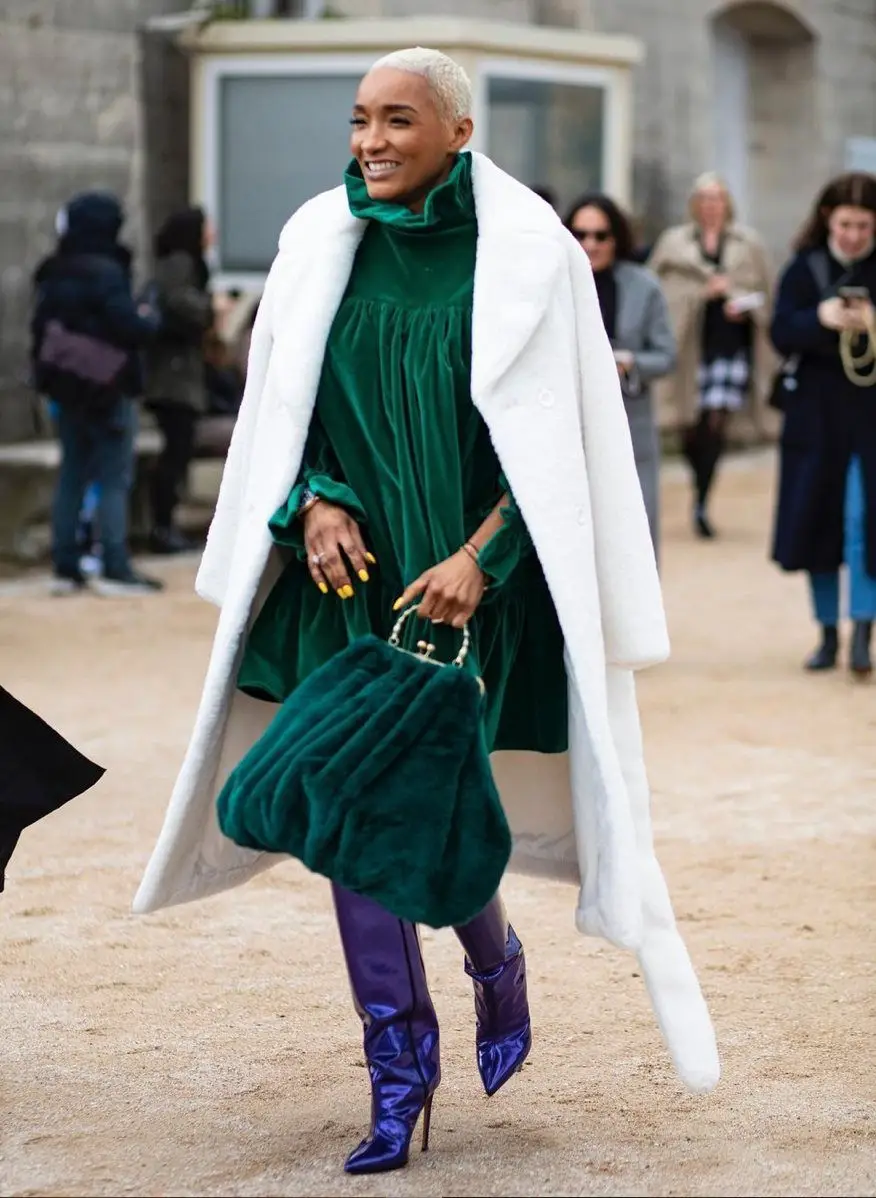 girl with green velvet high neck dress and green velvet bag