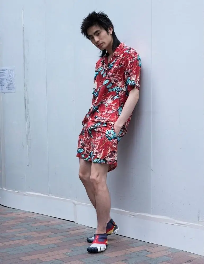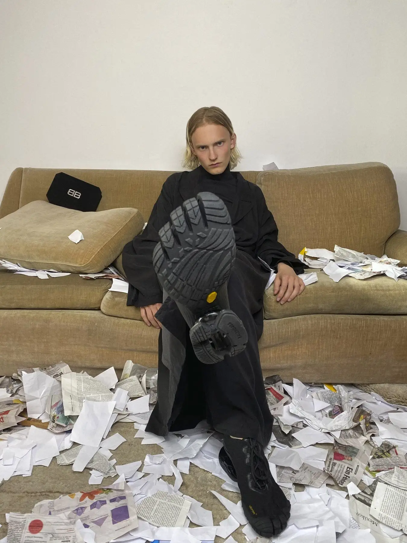 boy with five fingers Balenciaga sitting on a sofa surrounded by newspapers