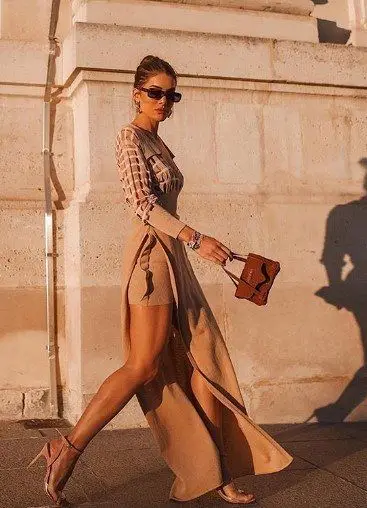 girl in beige dress strolls in the sun