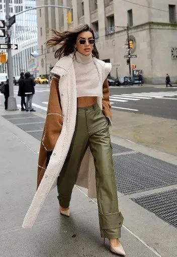 girl with sheepskin coat walks in the city