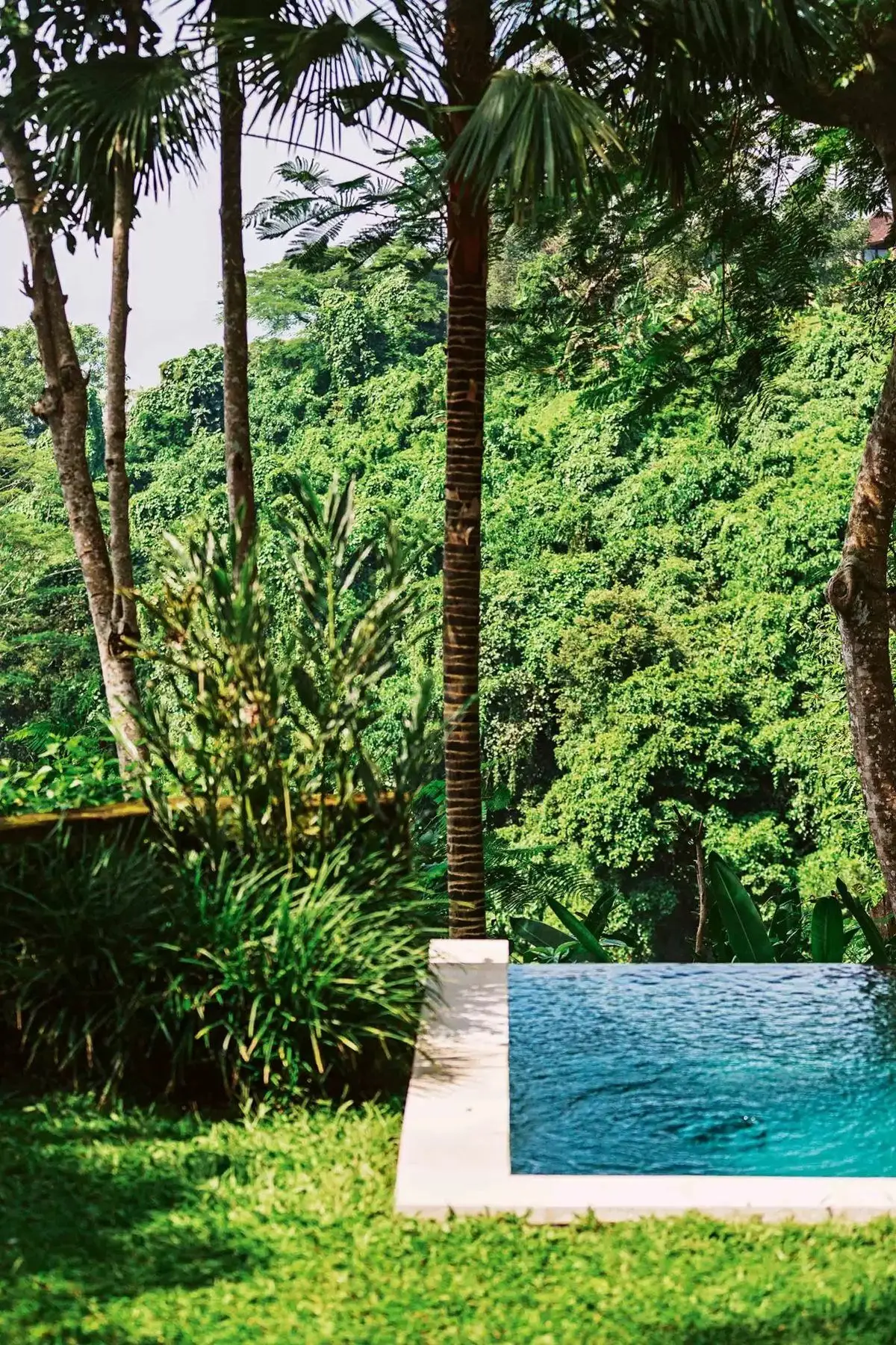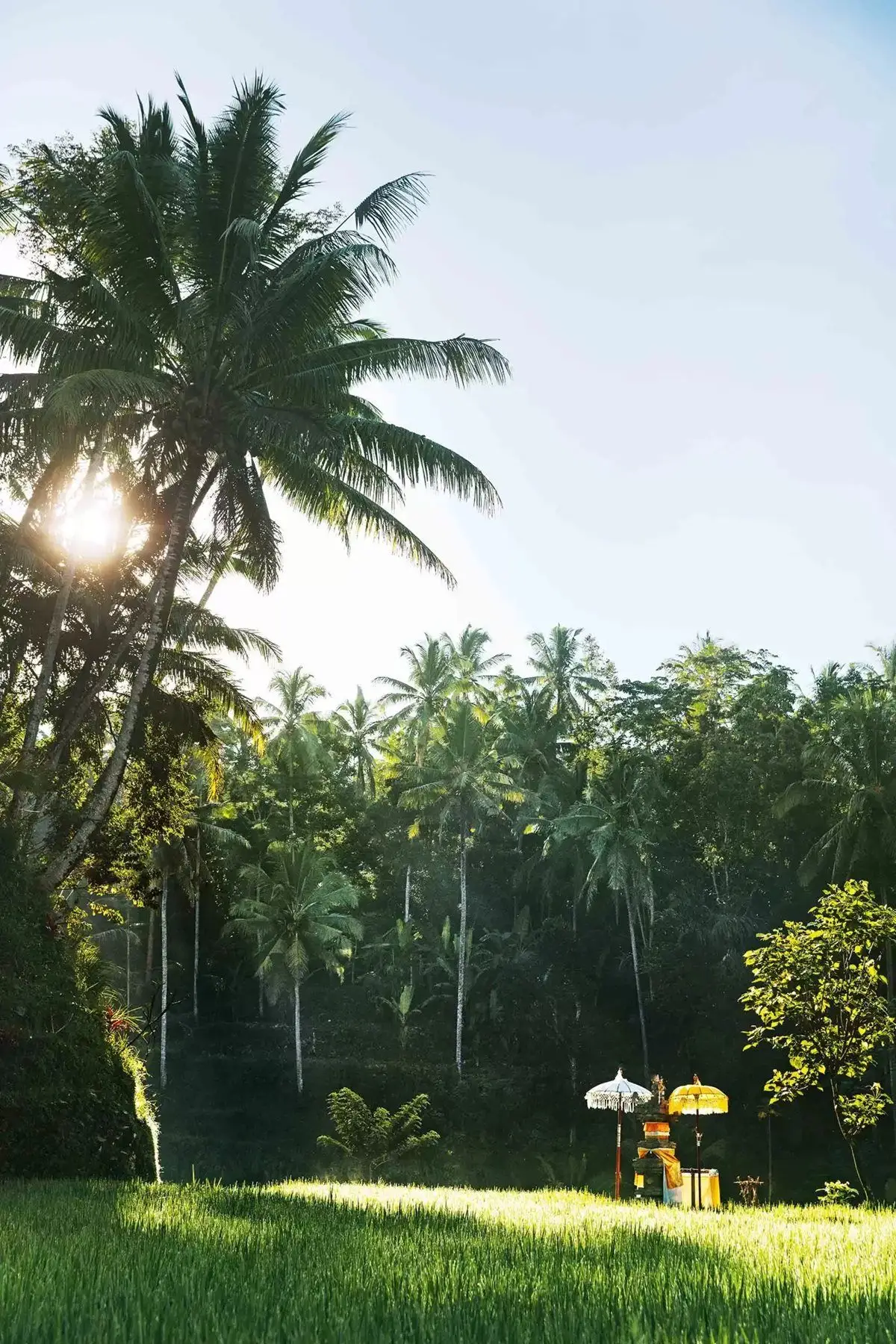 terraced vegetation borders the lush palm forest