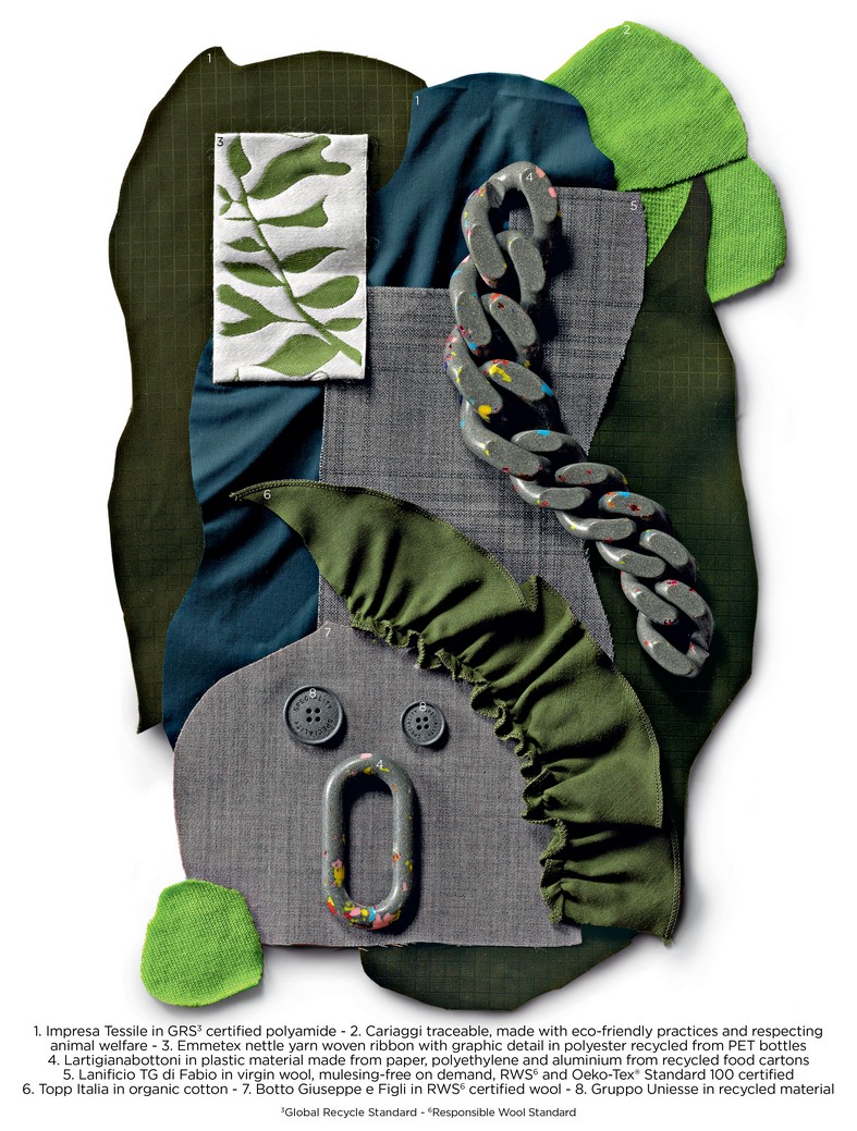 An immersion into Italian nature among these monumental, monstruous looking statues emerging from green foliage, inspiring a story of GRS certified polyamide, RWS certified wool fabrics, traceable yarns made with eco-friendly practices, ribbons in nettle yarn and accessories made from upcycled material.
