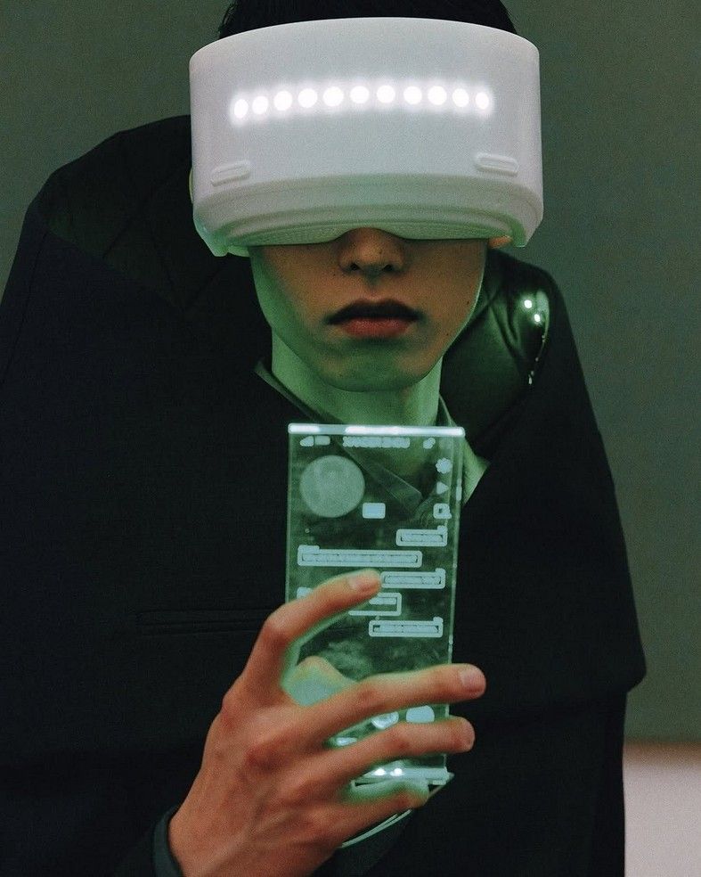 In Romantic future, the palette has the shades of a digital dawn, suspended between matter and code: deep blue and grey set off flashes of mauve and rosy highlights, embracing the deep green of sublime nature.
