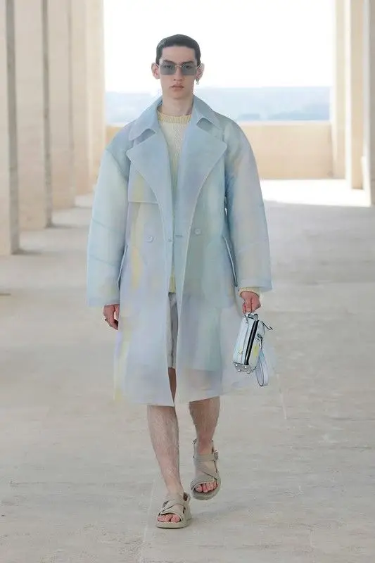 Style inspirations, menswear S/S 2023. Malleable textures, matt transparencies, grainy knits, cerulean pastels, from Fendi S/S 2022 men’s collection.