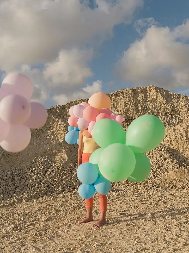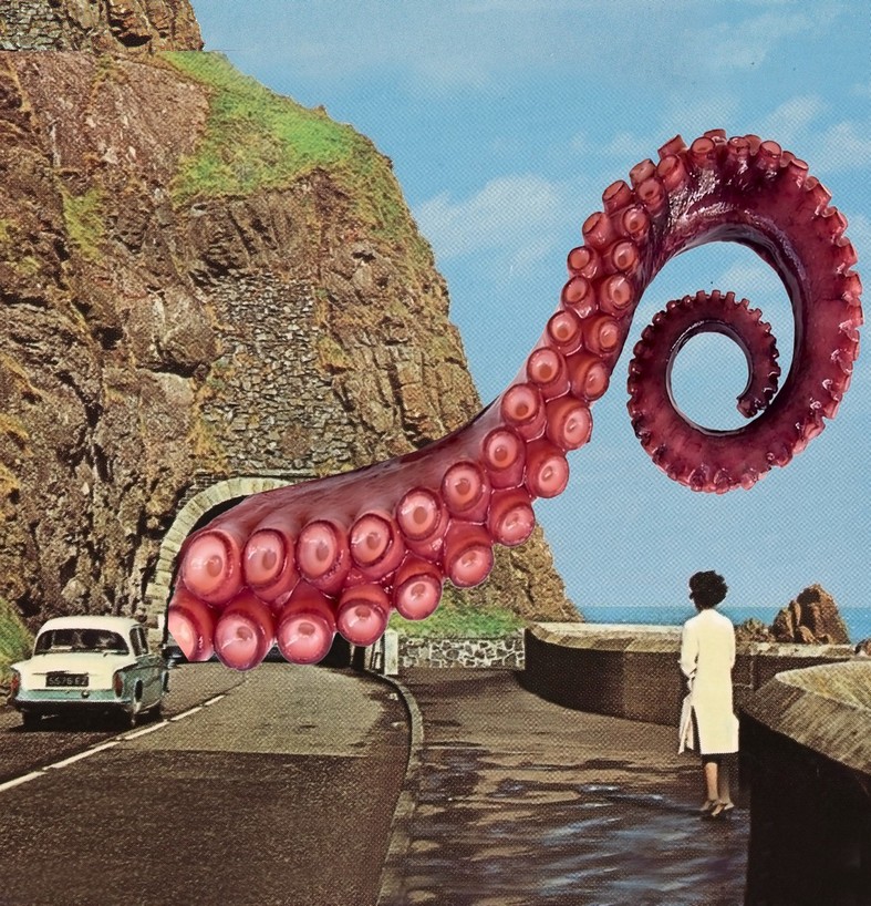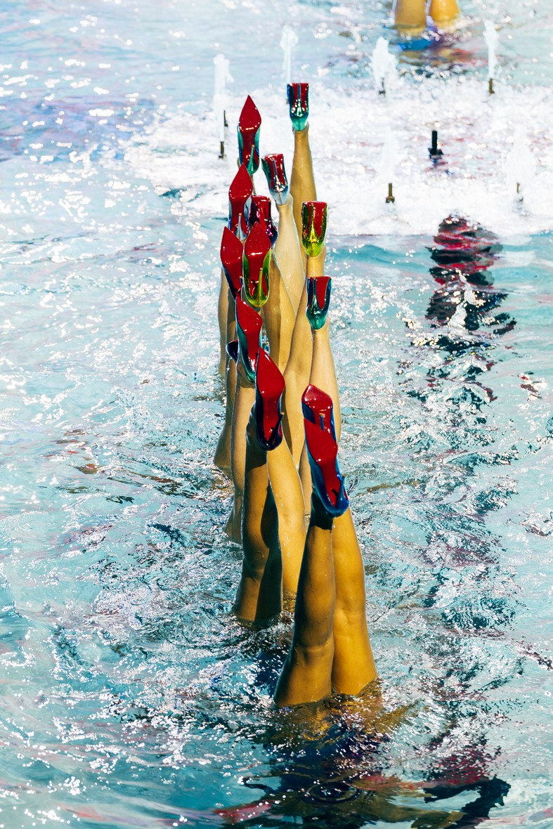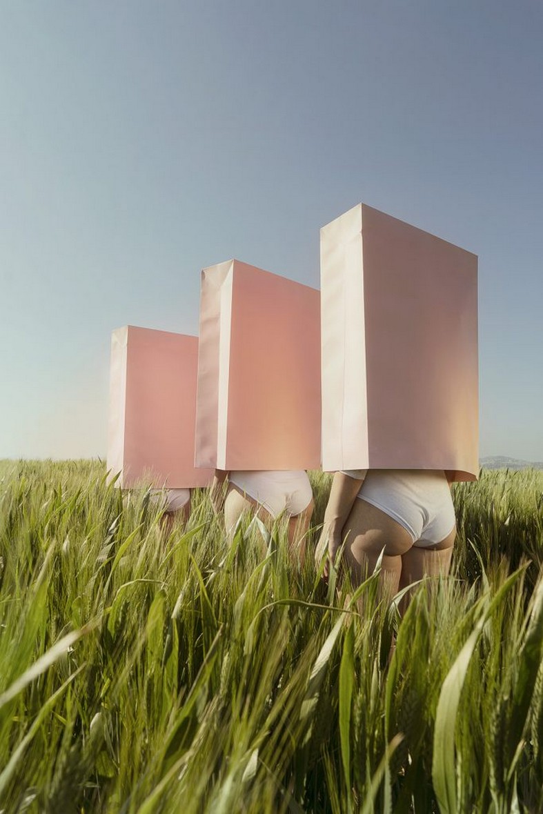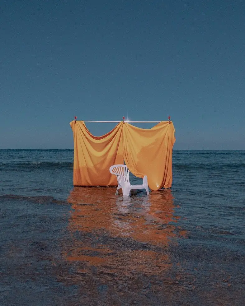 Imagine a summer that exists only in the mind. Imagine blinding sunlight making everything look artificial. Imagine flourishing gardens with fake grass, giant flowers and rubber giraffes. Imagine a calm sea, an orange curtain and a fried egg hanging on a line. A hand coming out of a shell, a plastic eye and swimmers in spike heels. Luminous landscapes break through boundaries into incredible surreal visions, like ones Miró, Magritte and Dalí would have produced if they had had digital tools and artificial intelligence. Scenes of ordinary and extraordinary madness reproduce the senseless flow of the unconscious, thanks to new multimedia languages. Strange animals, limbs and unimaginable characters are randomly arranged, like crazy splinters, the result of an imagination out of control. An array of left free objects, thoughts and words construct absurd visions charged with a subtle, sharp irony. It is a summer of colours and miracles, a non-place where anything can happen, where any thing can join with another, without disappointing expectations. Details taken out of context, foreign bodies; in a dream-like yet entirely plausible atmosphere, elements taken out of their usual reality appear and disappear, merge and blend, generating both surprise and hilarity. The dead calm of an unreal sea, the turquoise of an illusory swimming pool, together with the green of chimera gardens, act as recurring themes in this plastic oasis, in this modern, upside-down world.