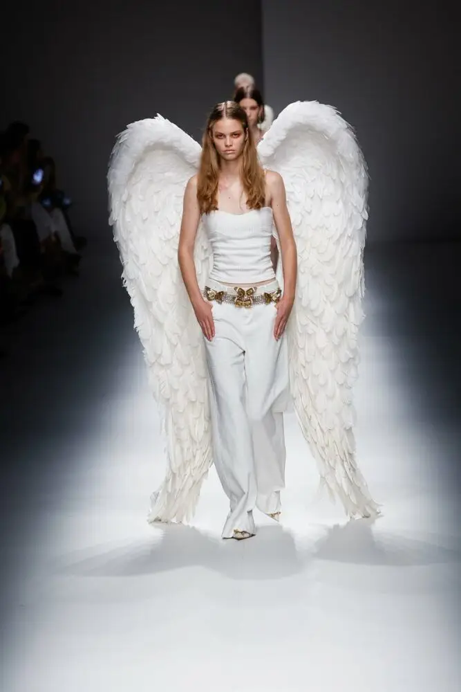 Dal pensiero di Nicola Brognano alla passerella di Blumarine, ecco angeli fin troppo fisici, che in certi casi non hanno comunque voluto rinunciare alle ali. Colori chiari, silhouette sottili, pepli da dea ma anche corsetti, pantaloni a vita bassa, abitini pieni di nodi e drappeggi, insomma celestiale e terrestre che si incontrano per celebrare la luminosità e la leggerezza dell’estate. Senza romanticismo e con più di un occhio all’estetica ’90/primi 2000.
