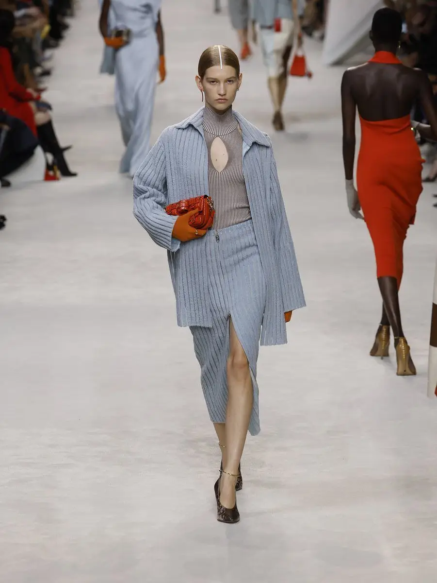 È una lady dall’eleganza grafica quella di Fendi, sui cui capi Kim Jones riprende i colori e le immagini di Roma. Linee semplici e allungate verticalizzano la figura, avvolta in capospalla minimali che accompagnano altrettanti lunghi abiti a tubo o dolcevita portati con morbidi pantaloncini. Color block, nodi e incroci ricorrono su top e tubini sinuosi, mentre guantini in maglia confermano la sofisticatezza del trend.