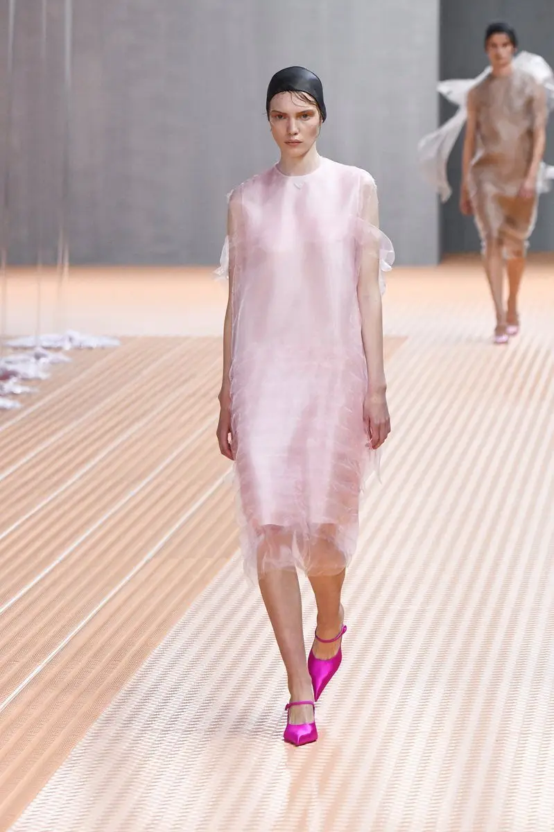 Se l’alta borghesia non si ritrova a casa Prada, allora dove? Sicuramente pensata per un pubblico giovane, l’ultima collezione alterna capi corposi, come mini-tailleur con cintura stretta in vita, su cui svolazza una mantellina in seta e blouson oversize, a eterei abiti in organza e camicie ricamate con maniche extralong dentro shorts a vita alta, da cui pendono frange ballerine.