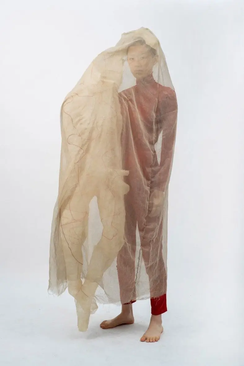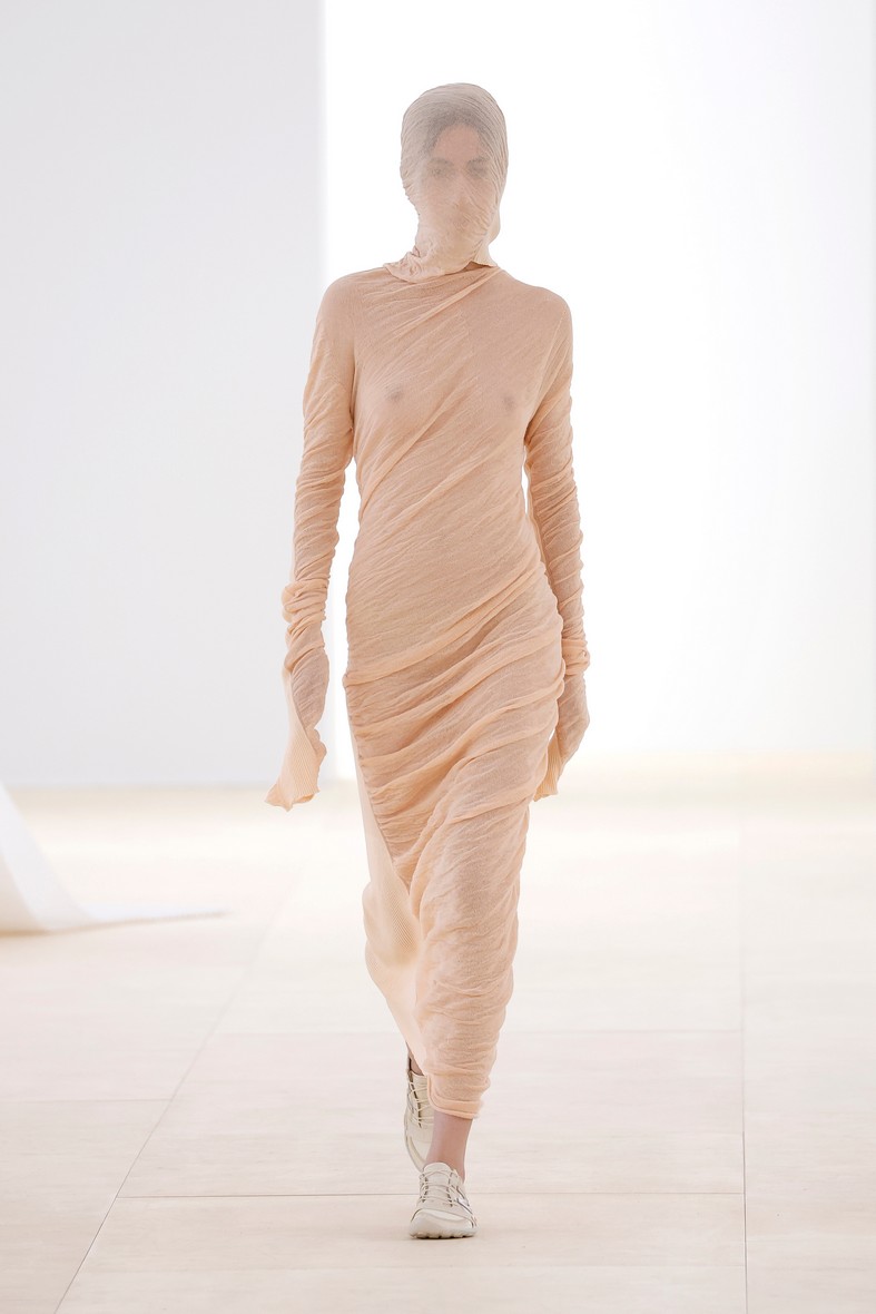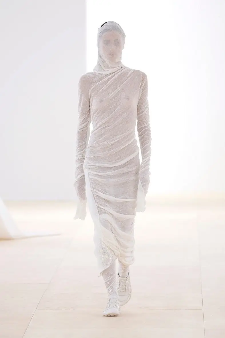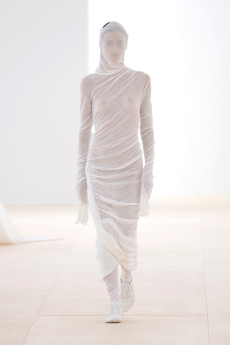Dalla collezione Issey Miyake donna P/E 2024, l’ispirazione Crisalide per l’abbigliamento donna P/E 2025 propone: abiti fascianti, texture trasparenti, drappeggi sottili, effetto bozzolo.