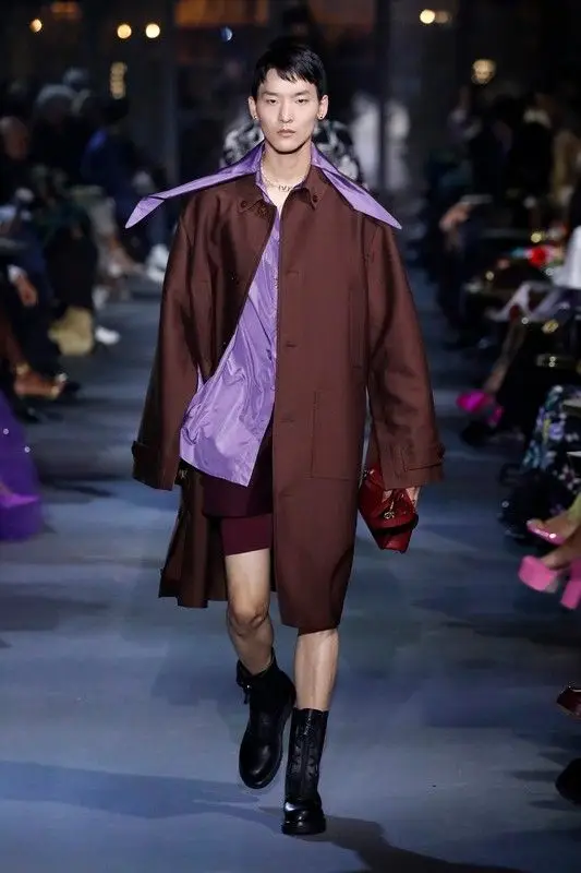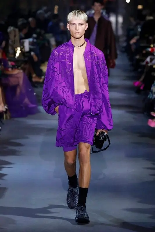 Ispirazioni di stile, abbigliamento uomo P/E 2023. Viola al neon, immagini in negativo, texture croccanti, lucido/opaco, dalla collezione Valentino uomo P/E 2022.