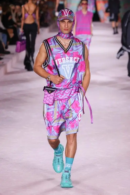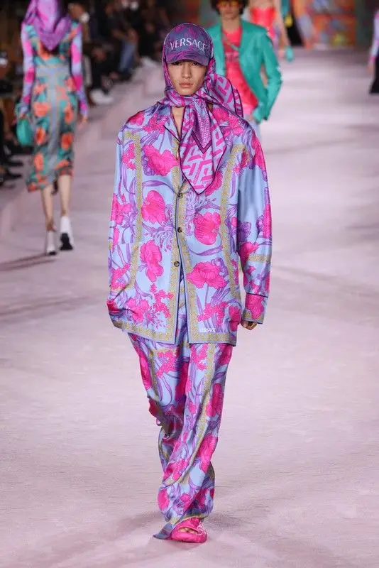 Ispirazioni di stile, abbigliamento uomo P/E 2023. Iper-ornamentale, streetstyle dolcificato, fiori stucchevoli, celeste e ciclamino, dalla collezione Versace uomo P/E 2022.