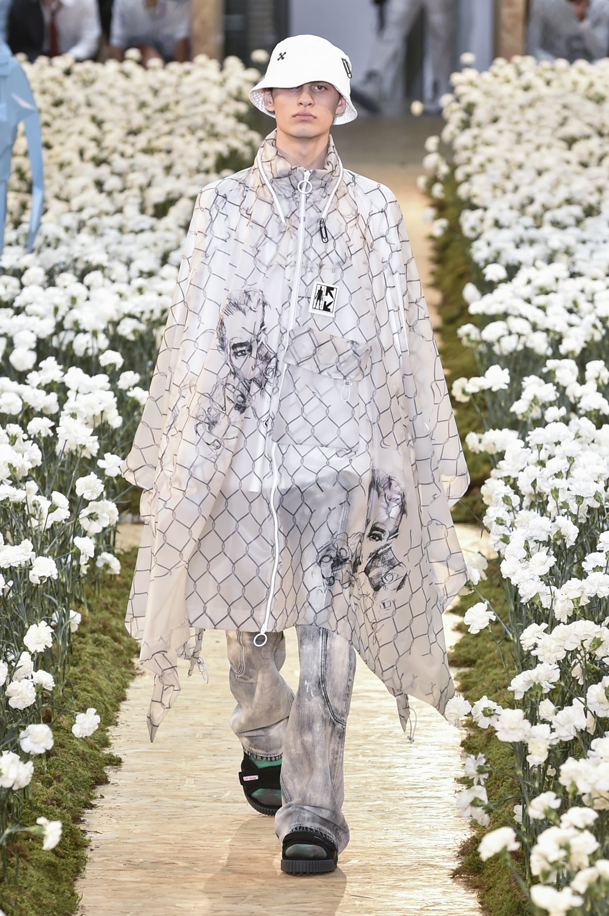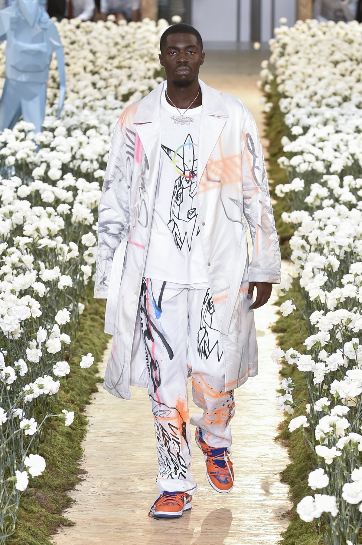 Modello con t-shirt, pantalone e giacca con stampe