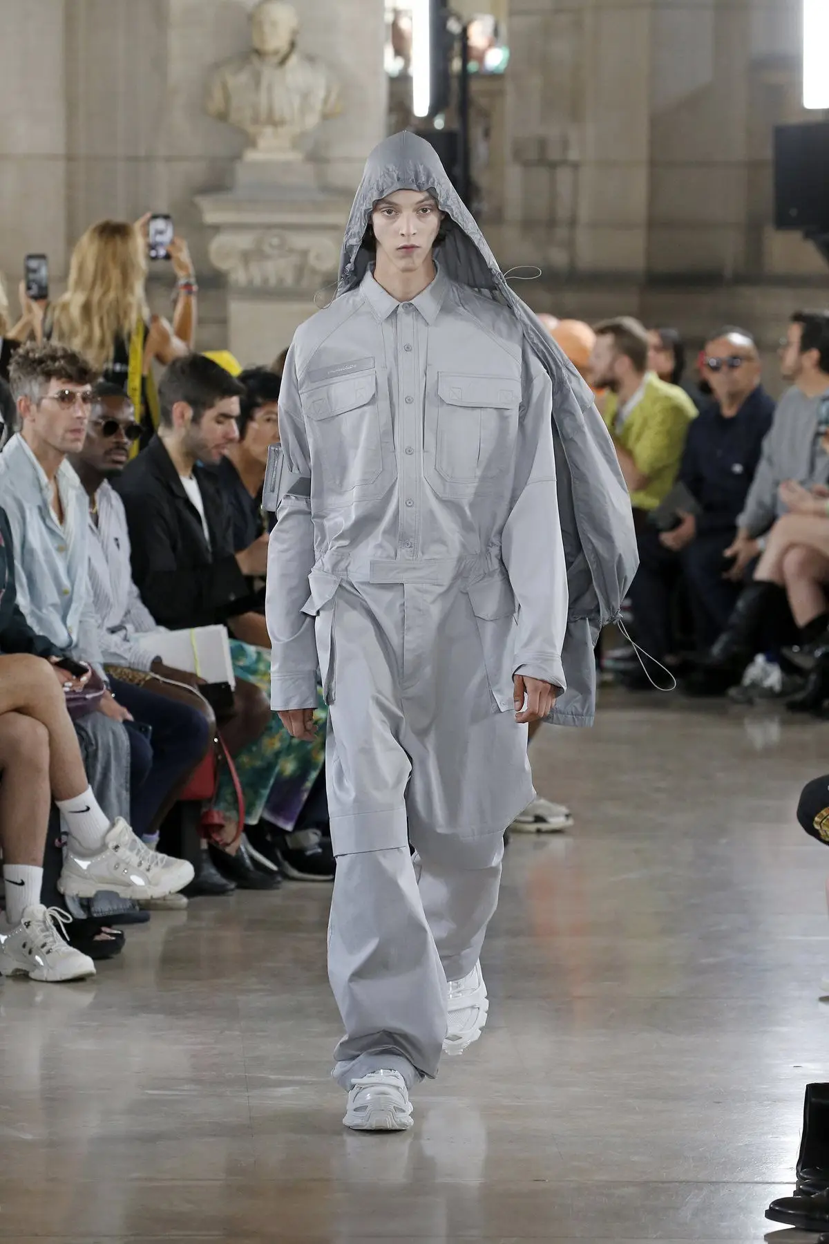 Modello con tuta da lavoro grigia