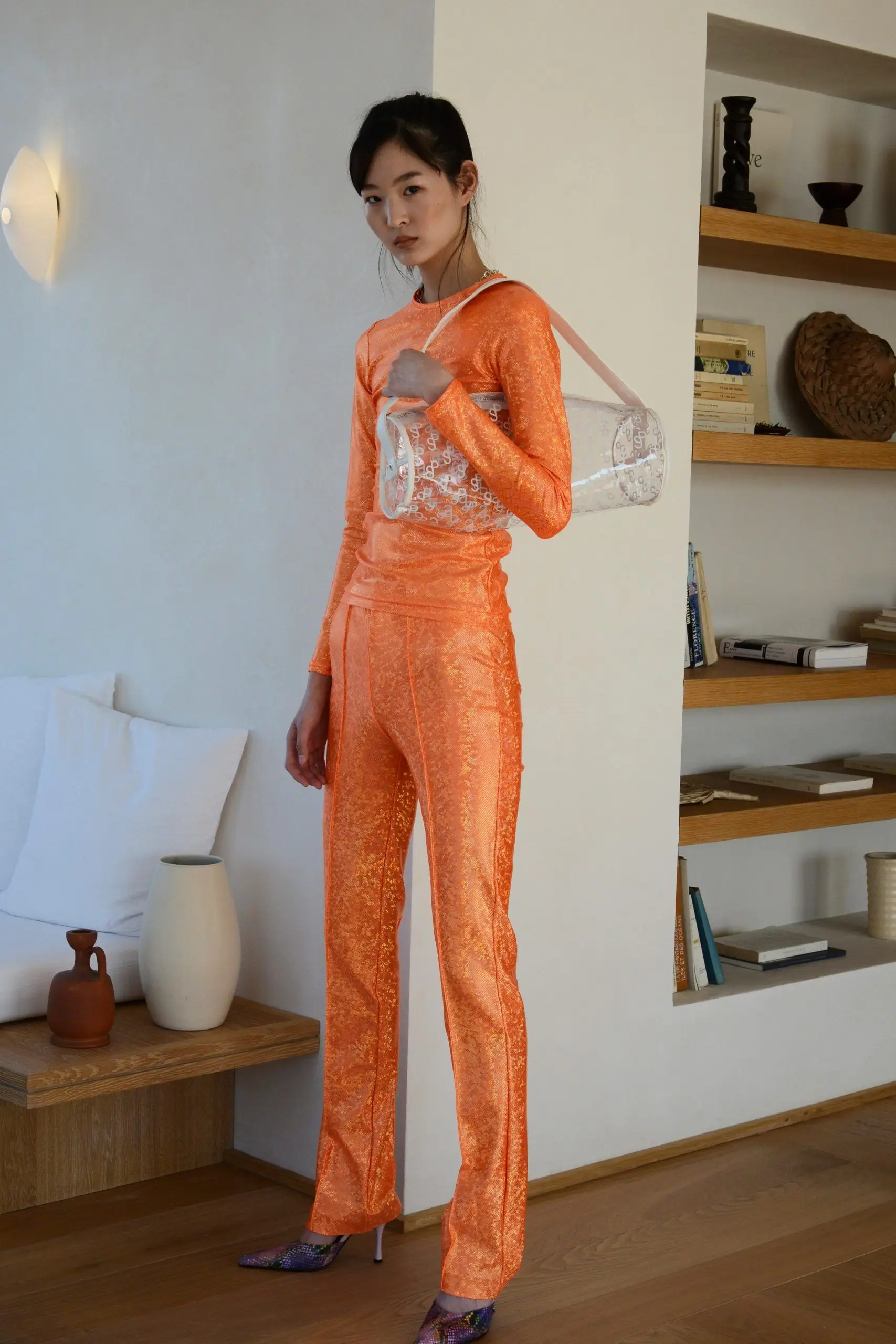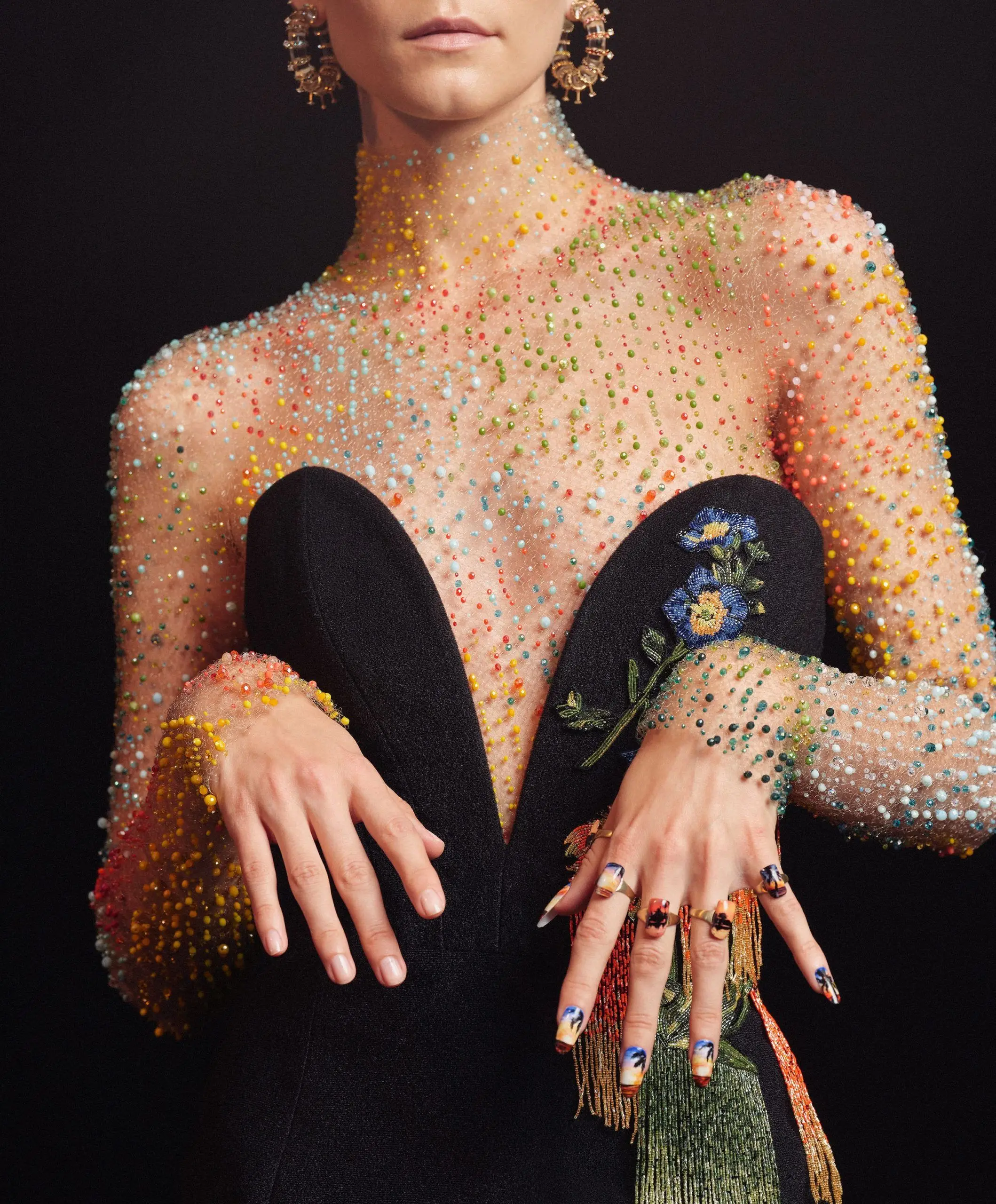 ragazza con abito nero e blusa trasparente ornata da lustrini