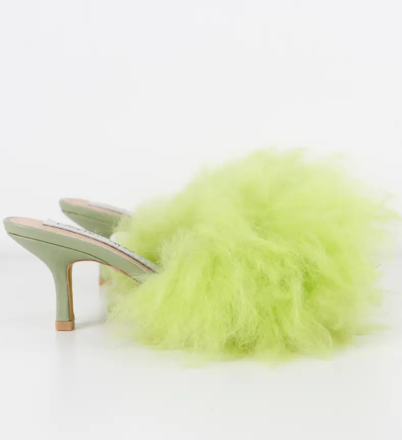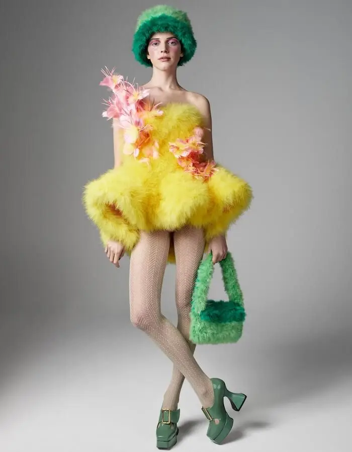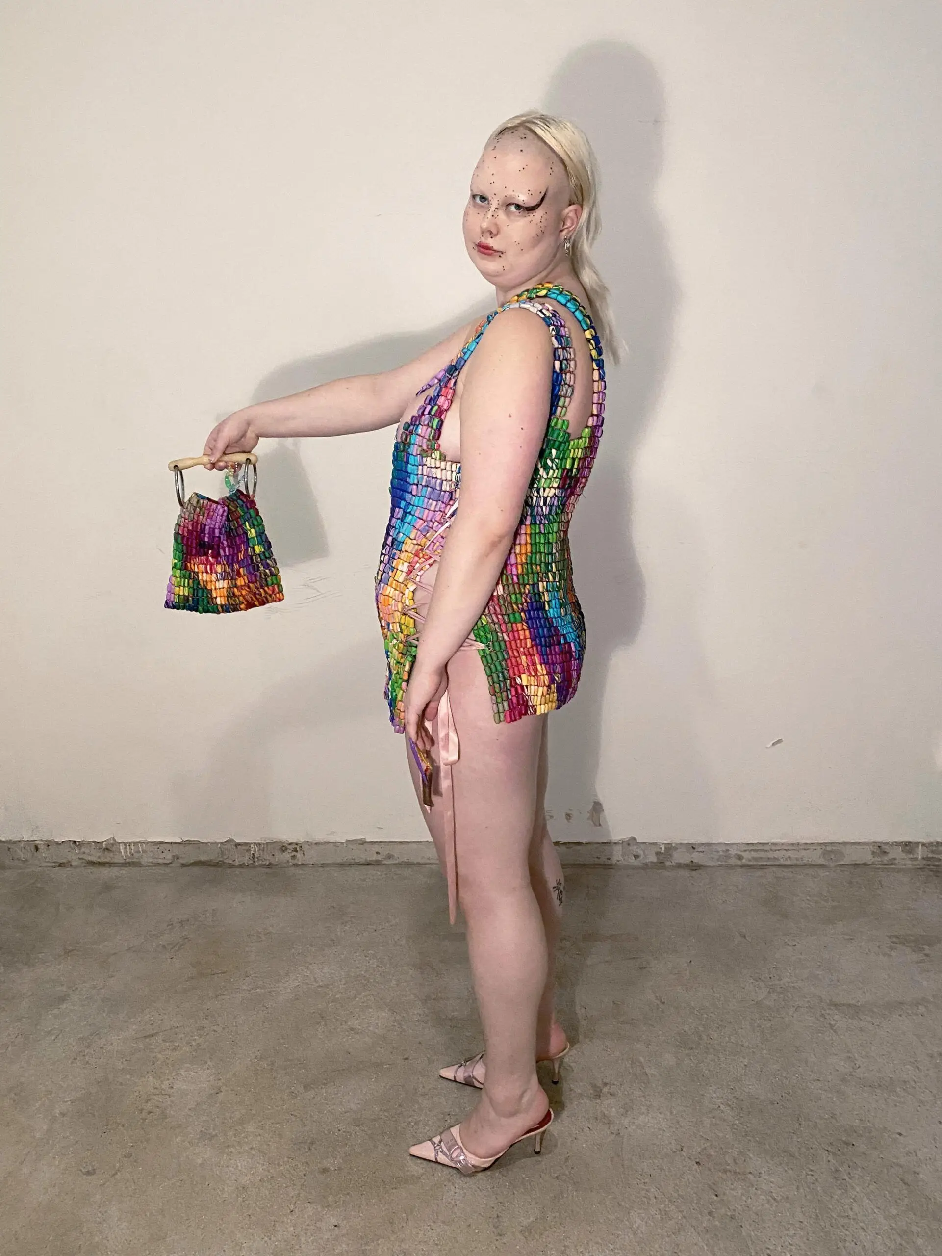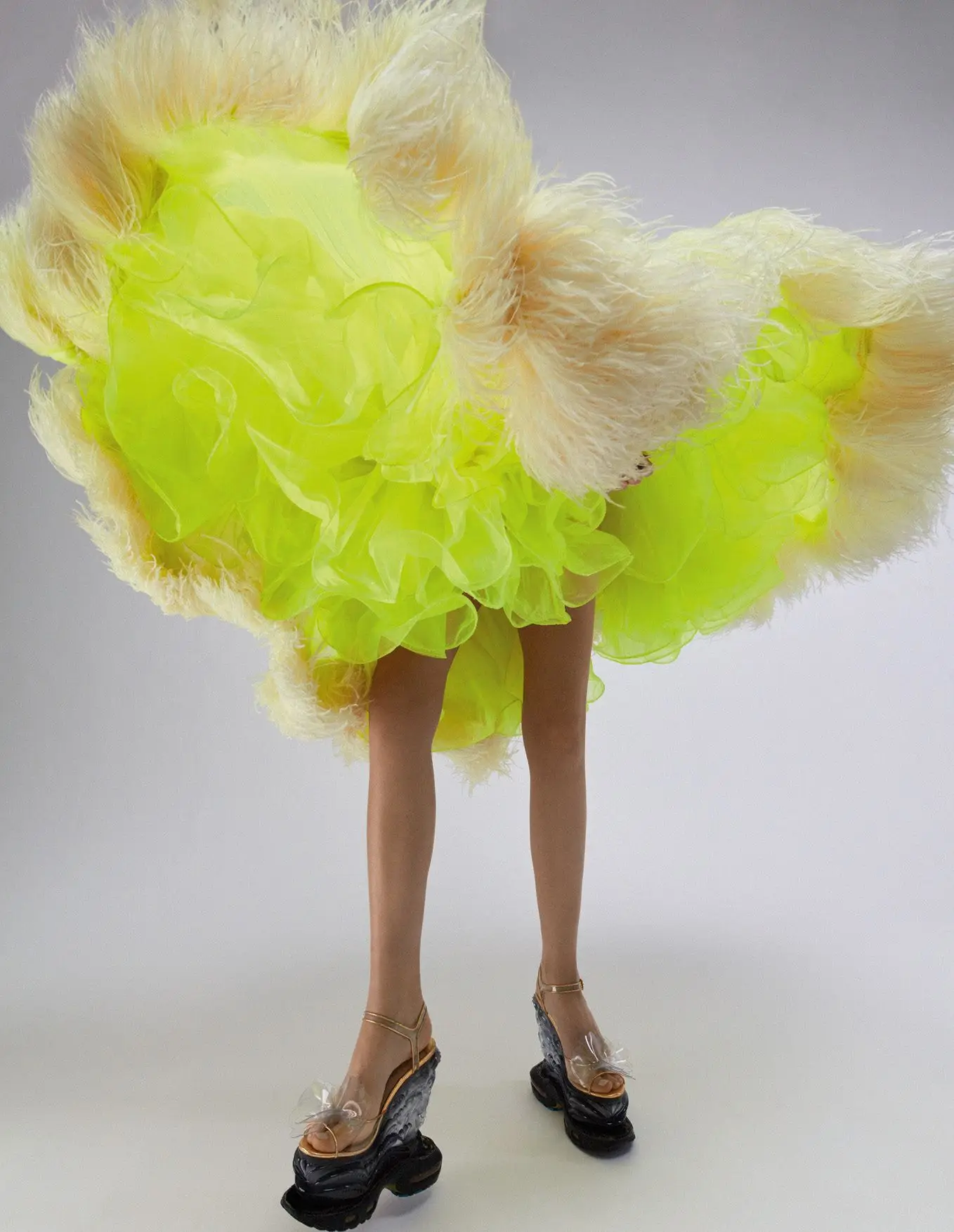 ragazzo con gonna di lustrini e scarpe col tacco verdi