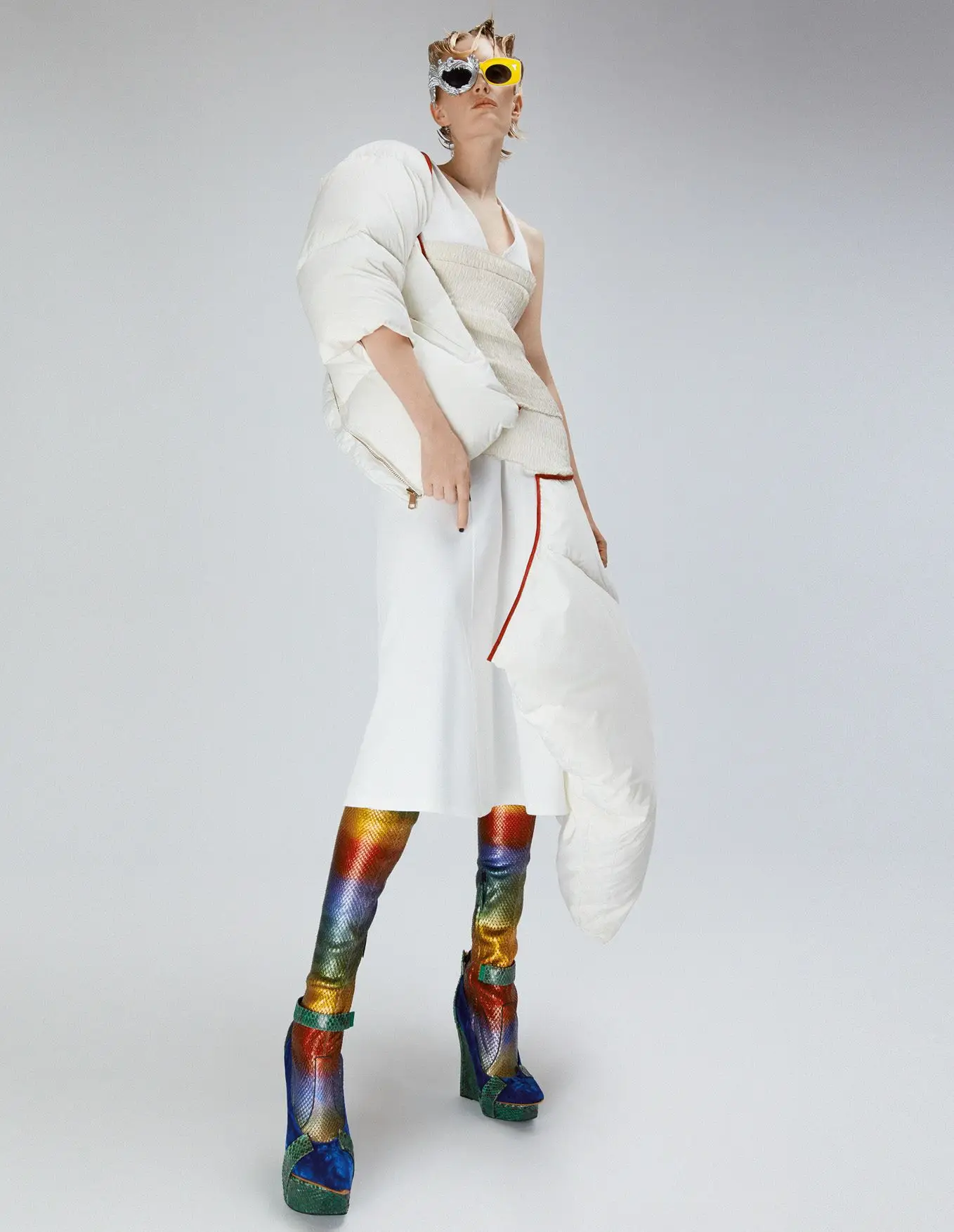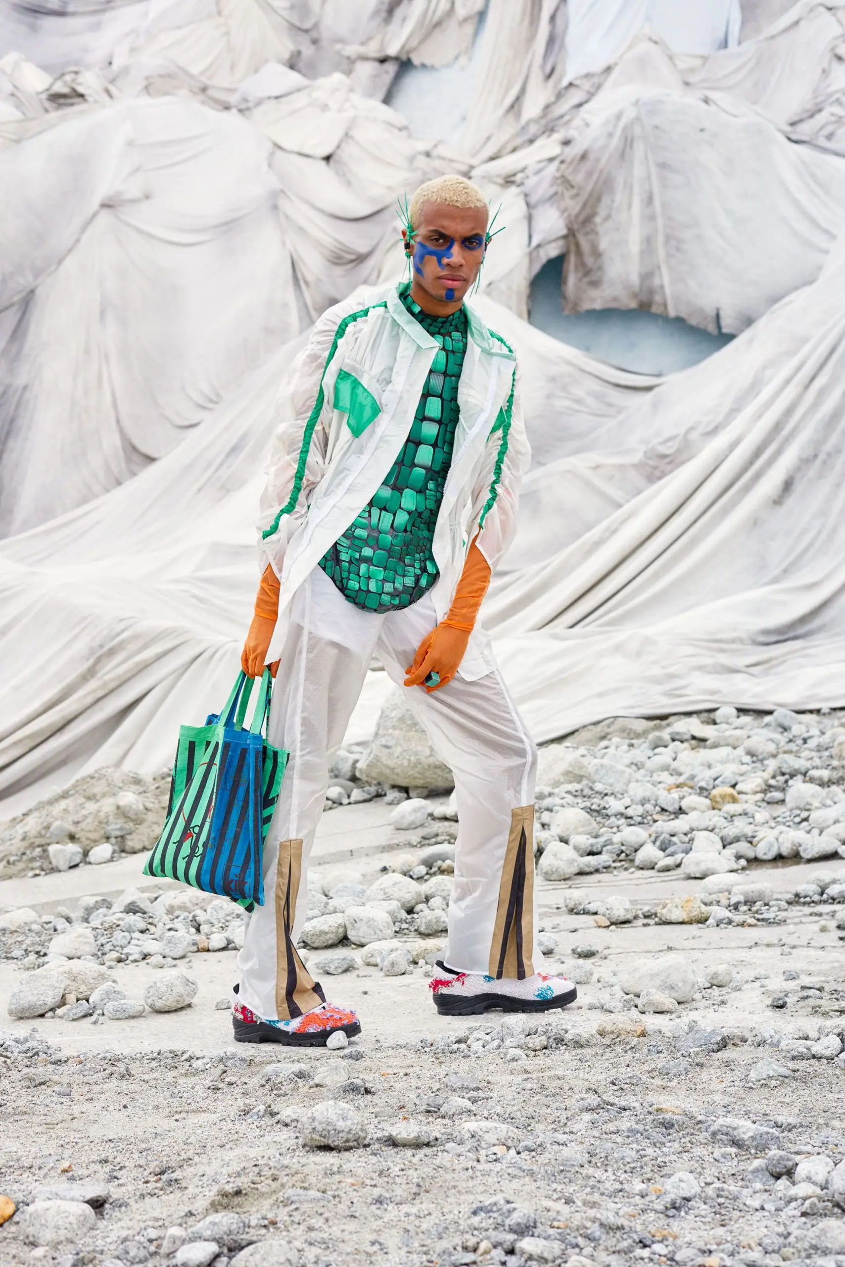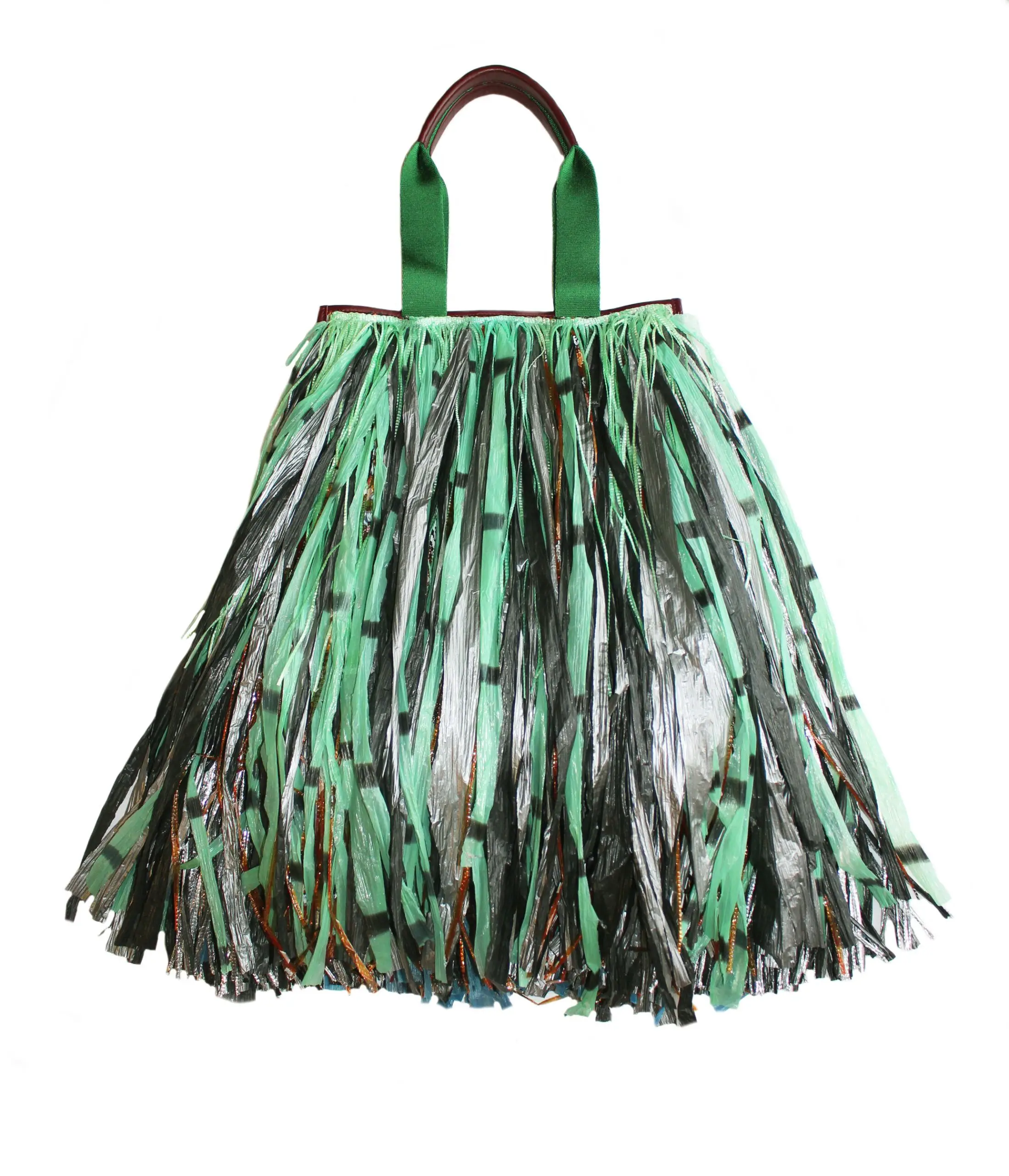 ragazzo con gonna di lustrini e scarpe col tacco verdi