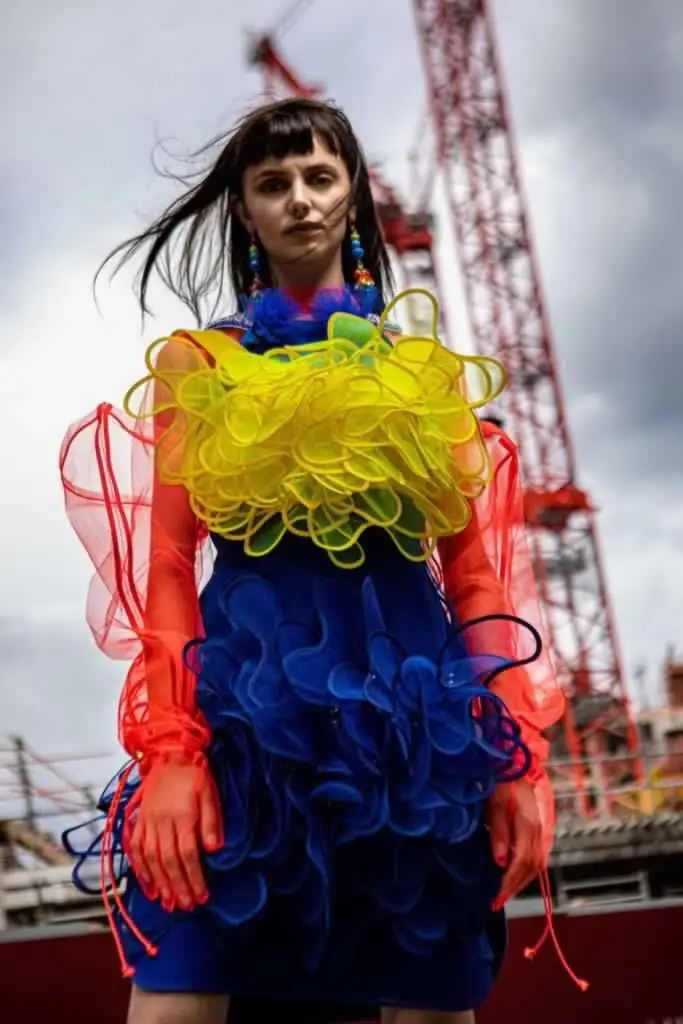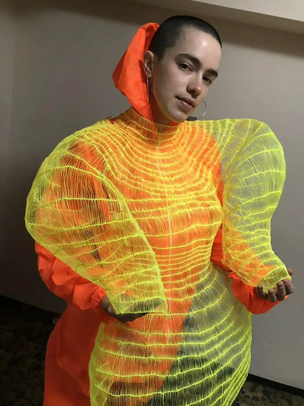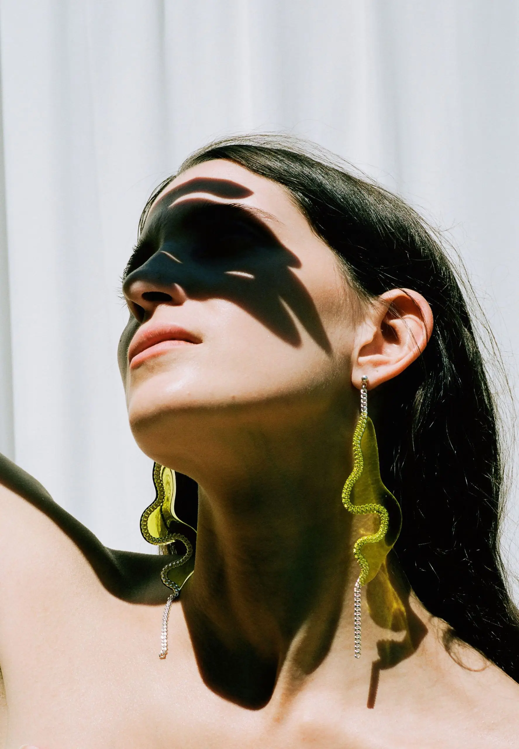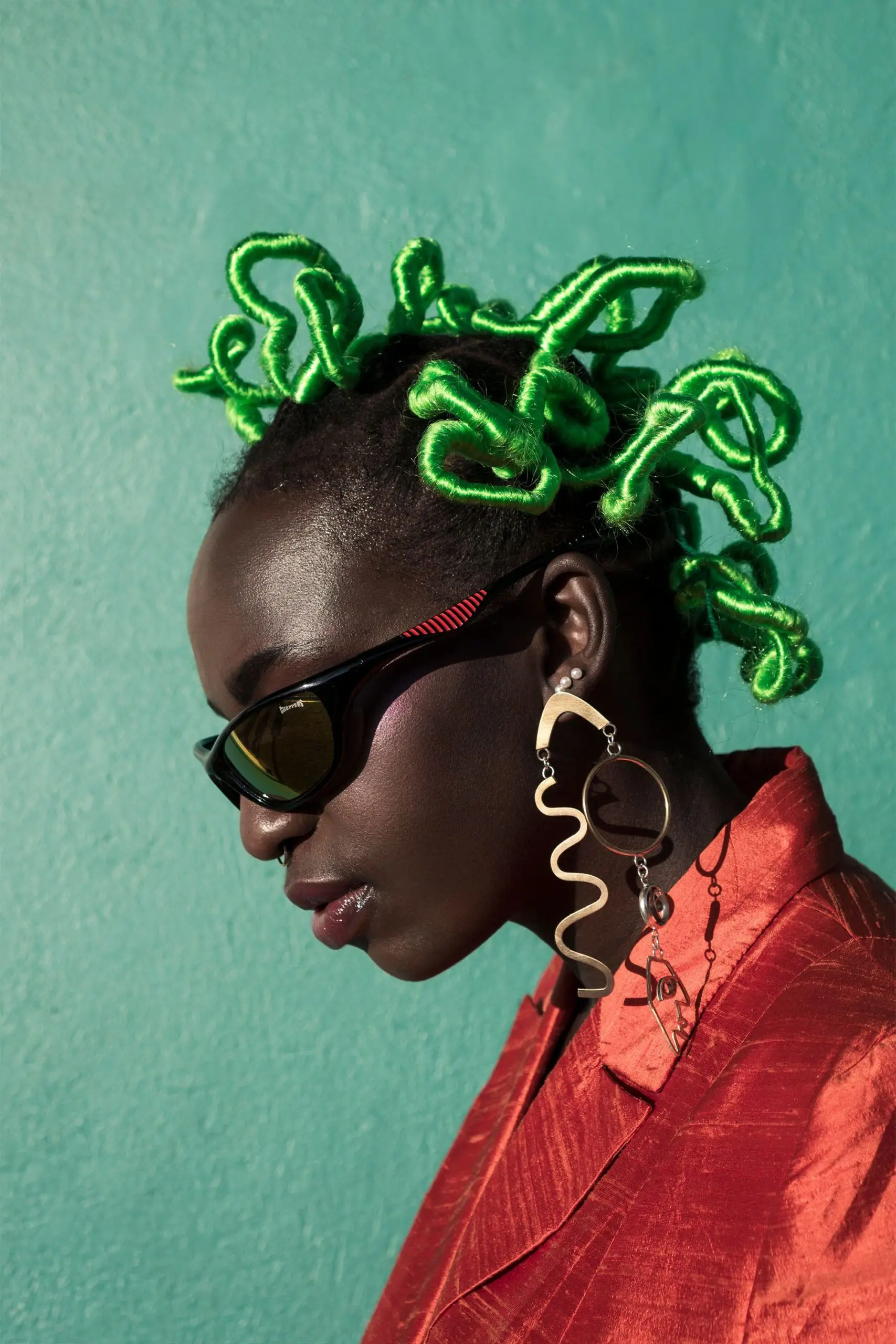 ragazza con acconciatura afro verde fluorescente e orecchini ornamentali