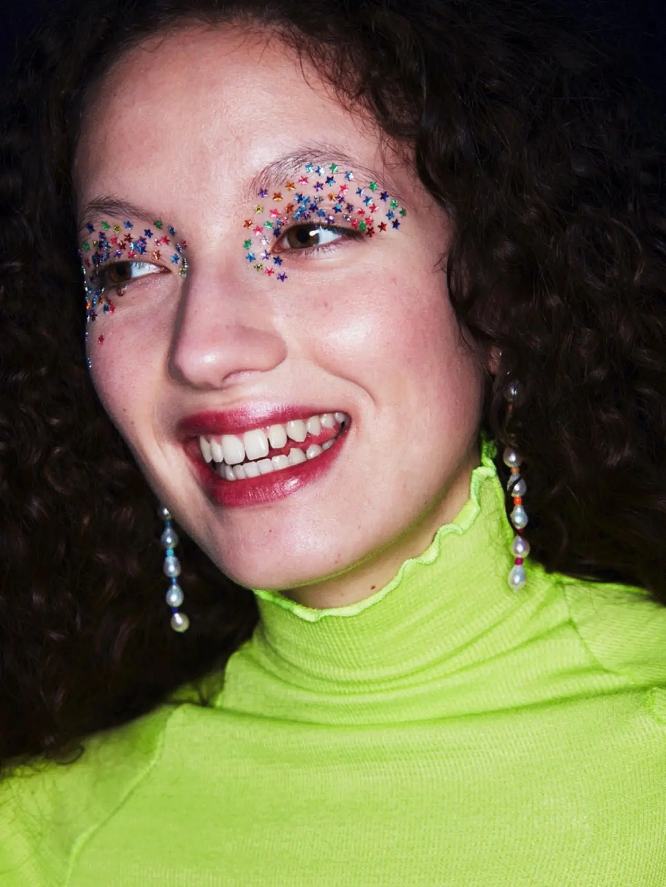 ragazza con lupetto verde flou e lustrini sugli occhi