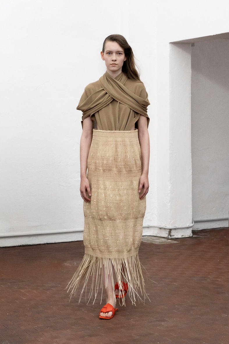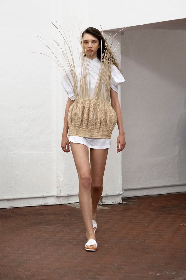 Dalla collezione Setchu donna P/E 2026, l’ispirazione Primordiale per l’abbigliamento donna P/E 2027 propone: memoria storica, materie primitive, rituali atavici, rami, paglia e cortecce.