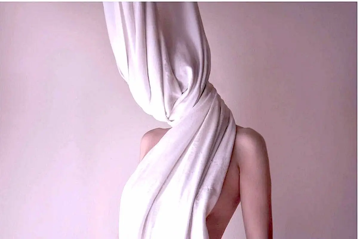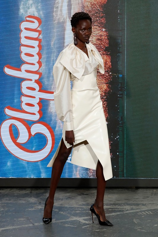Ispirazioni di stile, abbigliamento donna P/E 2023. Morbidezze plastiche, volumi intersecati, fluido vs costruito, bianco lattice, dalla collezione Andreas Kronthaler for Vivienne Westwood donna P/E 2022.