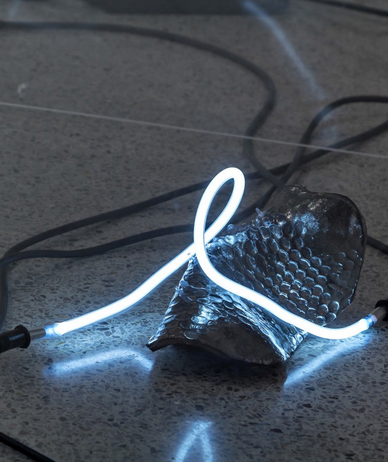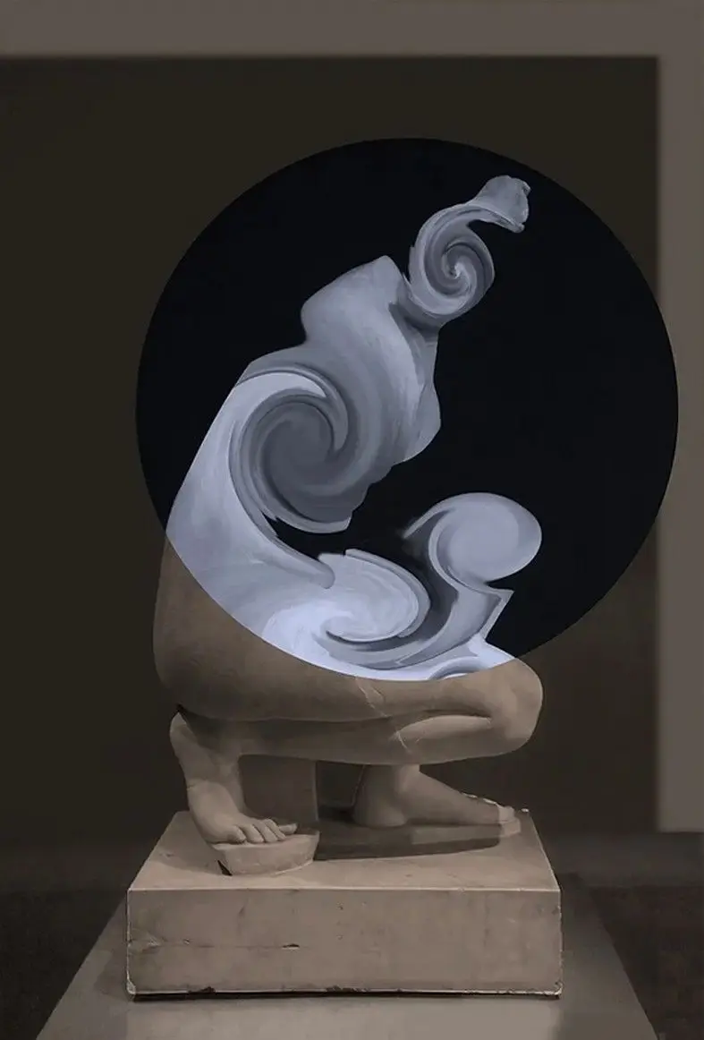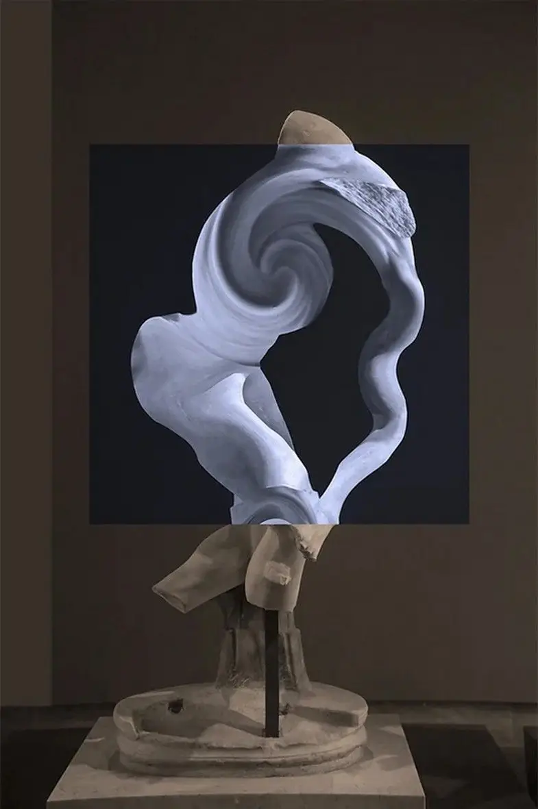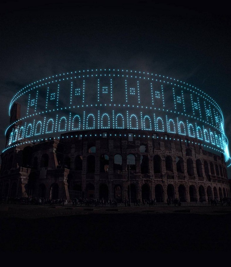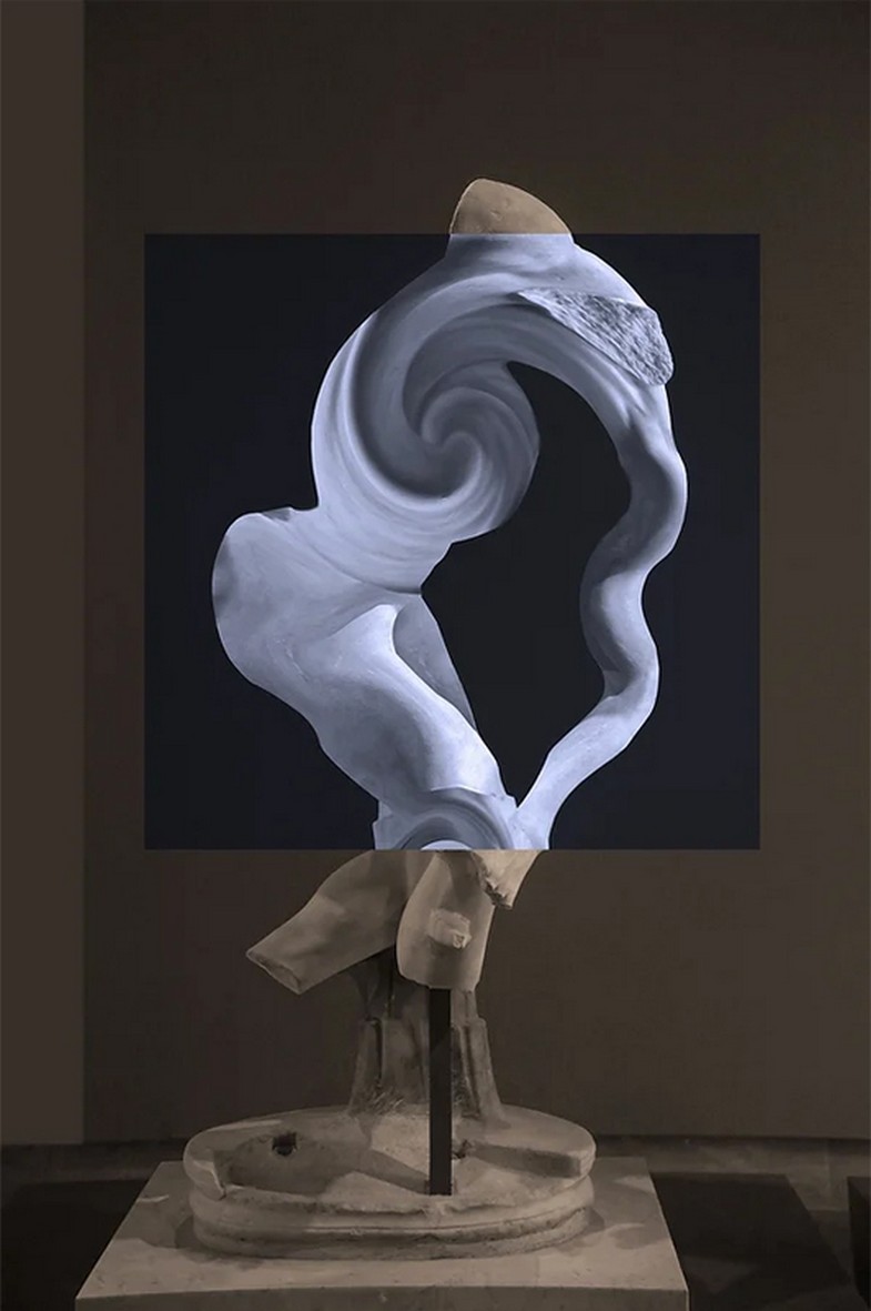 I nuovi codici multimediali dell’arte contemporanea disegnano, in Visualize the improbable, giochi di droni nel cielo, immaginando di ricostruire monumenti incompleti grazie alla luce. Quasi per annullare la distanza tra la storia remota e un mondo virtuale che spesso spaventa, vetuste costruzioni architettoniche, andate distrutte o non finite, si completano illusoriamente attraverso sofisticate protesi luminose. Moderni linguaggi digitali e ricordo del passato si incontrano. La tecnologia diventa presenza positiva, ergo, luce. Si trasforma in qualcosa che ricostruisce e ricompone quello che manca, che rende visibile l’inverosimile, un elemento costruttivo e visionario a un tempo. Ancora, spazi espositivi futuristici accolgono arcaici vasi e canopi etruschi. Opere millenarie riacquistano le parti mancanti grazie a stampe 3D, guadagnando un nuovo valore estetico ma anche funzionale. Statue create tramite intelligenza artificiale richiamano resti distorti di vestigia classiche. Video mapping, proiezioni luminescenti creano pattern e ologrammi su facciate di cattedrali e palazzi ma anche su abiti, dando vita a movimenti illusori nei drappeggi di tessuto. Contrasti e giochi d’ombra fanno da sfondo a matrimoni felici tra antico e contemporaneo.