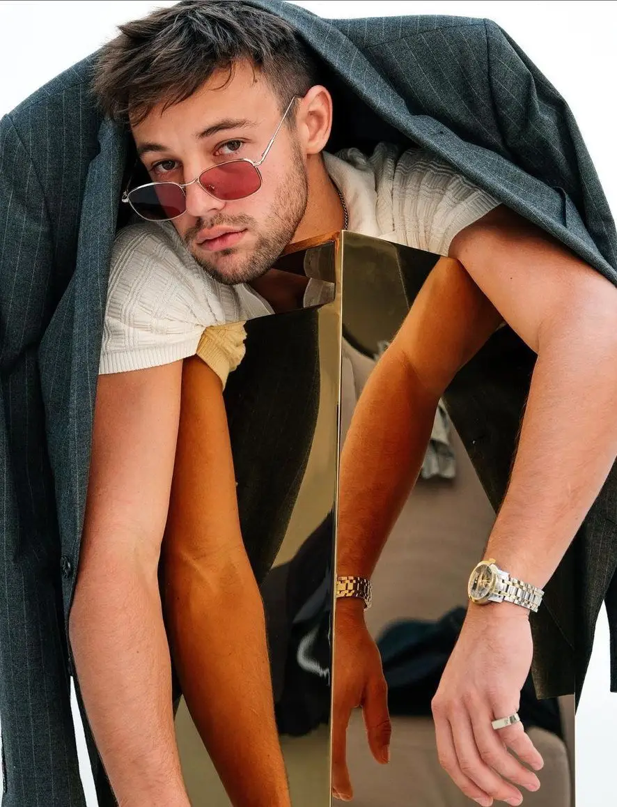 ragazzo con outfit casual e specchio sotto il braccio