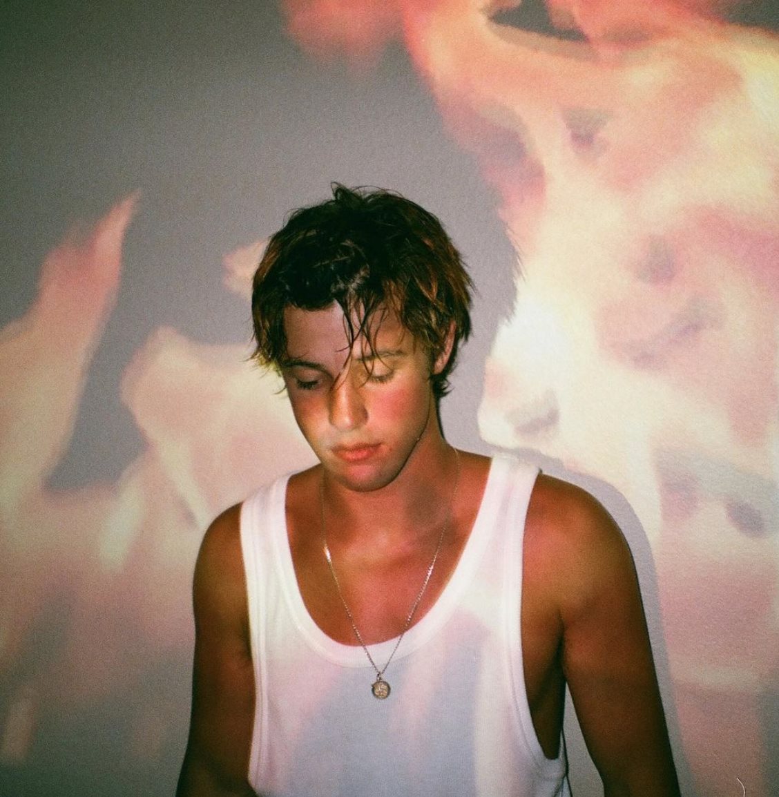 ragazzo con canotta con proiezione di fiamme sul muro