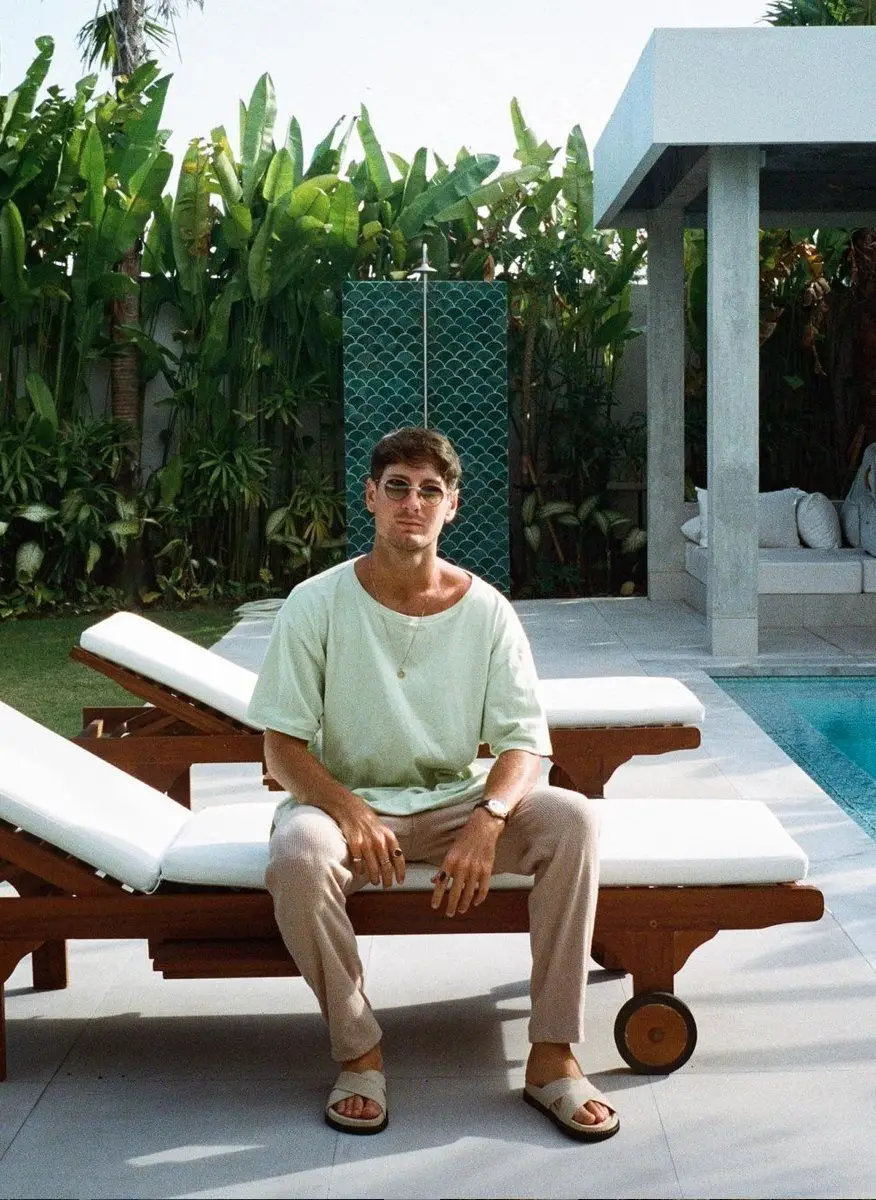 ragazzo con outfit dai colori tenui seduto a bordo piscina