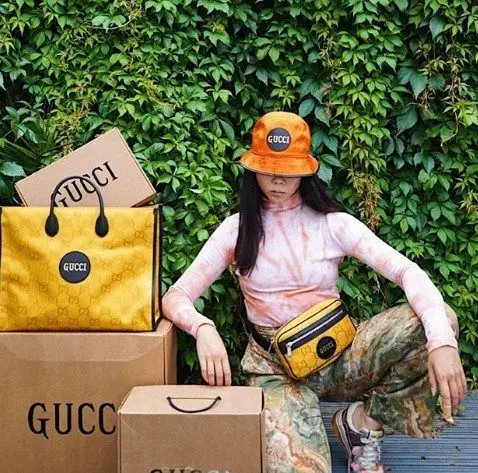 ragazza inginocchiata con accessori e scatole Gucci