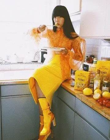 ragazza con look total yellow degusta pasta Rummo x Fendi