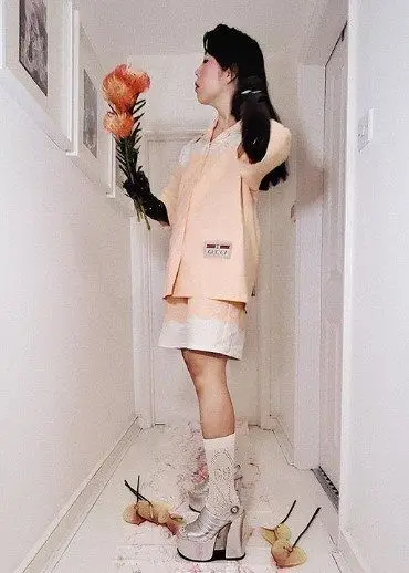 ragazza con outfit Gucci e fiori tra le mani