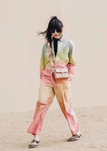 ragazza con tuta multicolore borsa a tracolla rosa